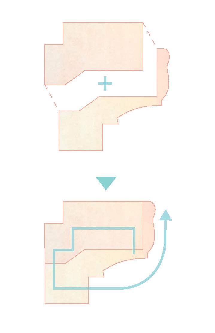 二本の軸線が広がっていく形状を 黄金螺旋に見立てる。