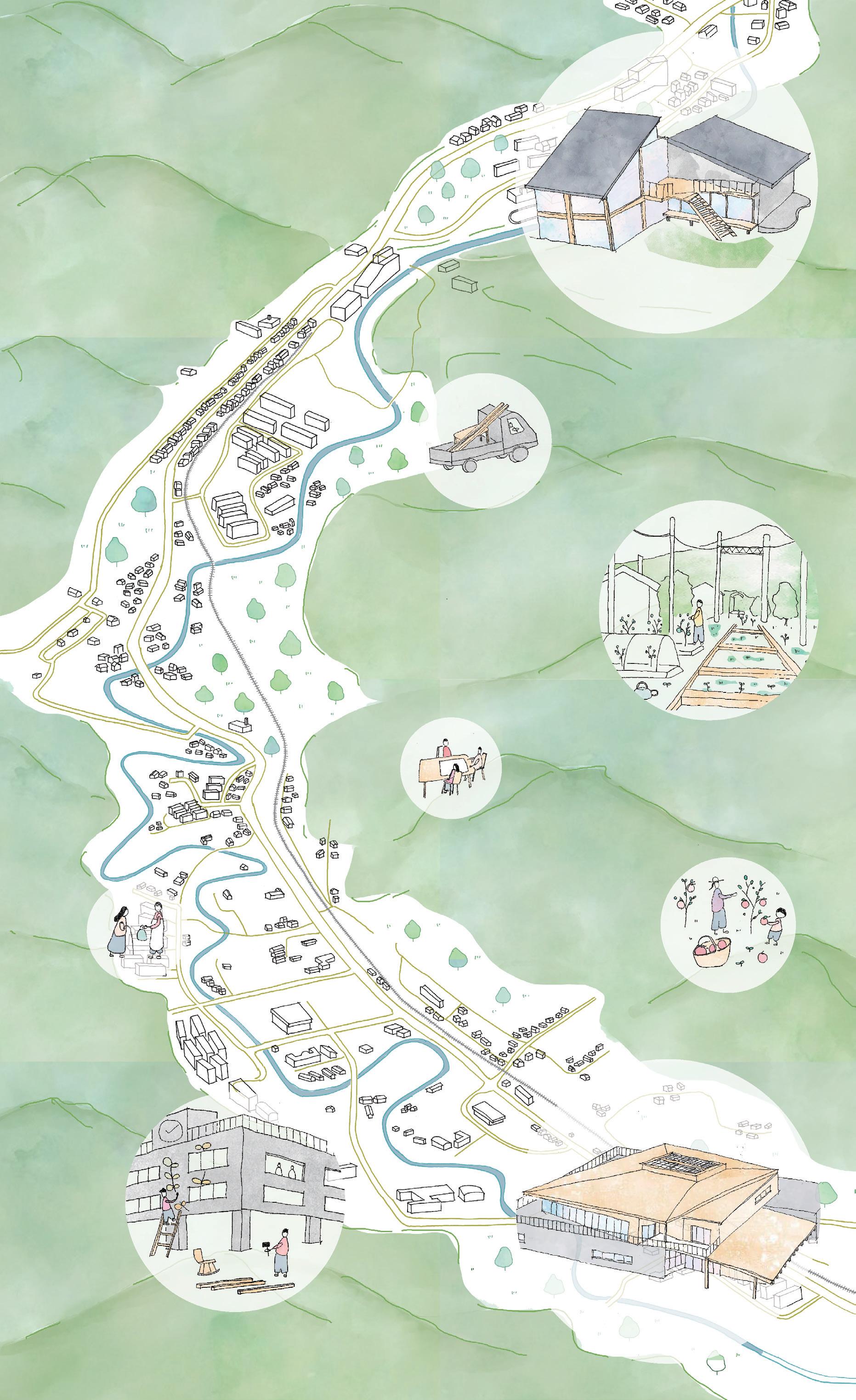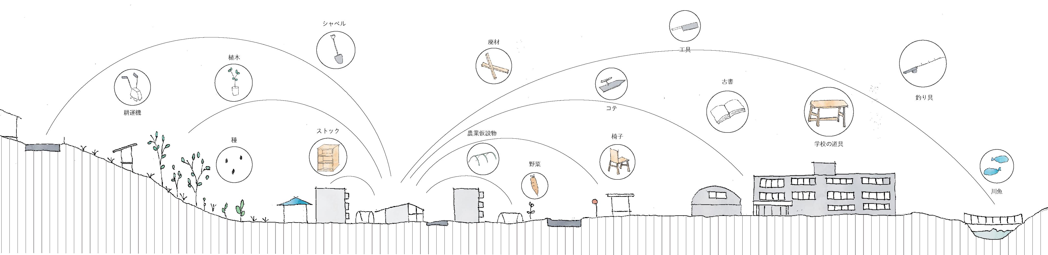 あるひとつの建築を提案すると、その周りの人と資源につながりが生まれる。 ここでは異なる地区それぞれに建築を計画し、