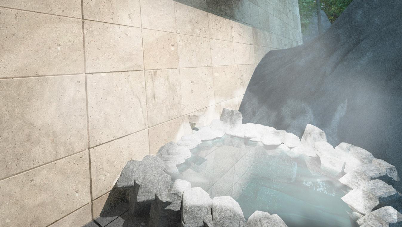 テラスを突き抜ける岩 スラブを支える岩 新しい岩になる 岩肌の元に 広がる浴室