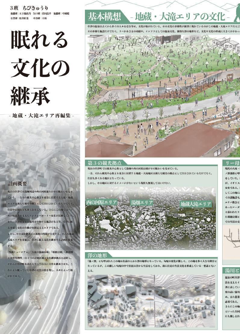 草津の文化は多くの人々によってひっそりと語られ ているが、現在その「文化の語り手たち」の継承が 問題となっている。草津の多様な文化が眠る地とし て地蔵・大滝エリアを対象に、新たな文化継承の在 り方を提案する。