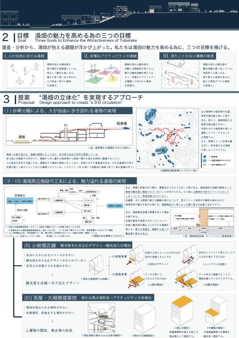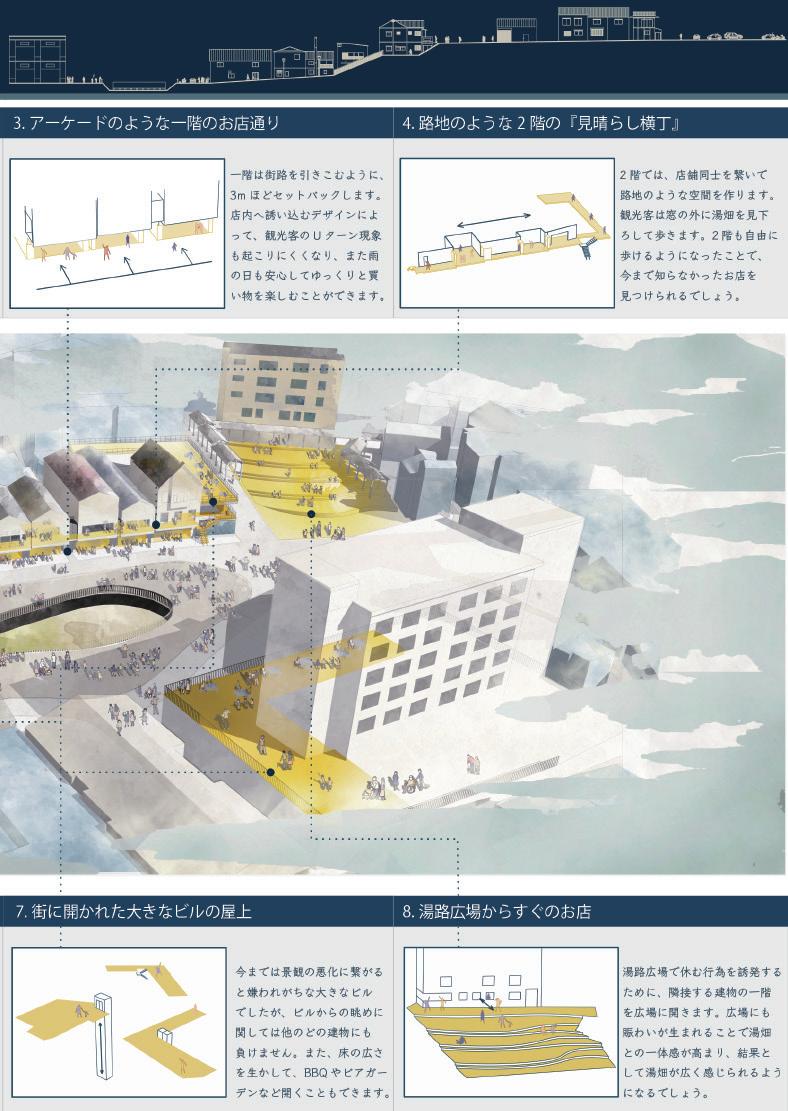 湯畑に立体的な観光体験を創り出す。近年、観光客 が湯畑に集中することで、周縁部との距離や、湯畑 内の混雑が深刻となっている。私たちは、一階店舗 と共に上層階の動線をデザインすることで、より便 利で、多様で、美しい湯畑を提案する。