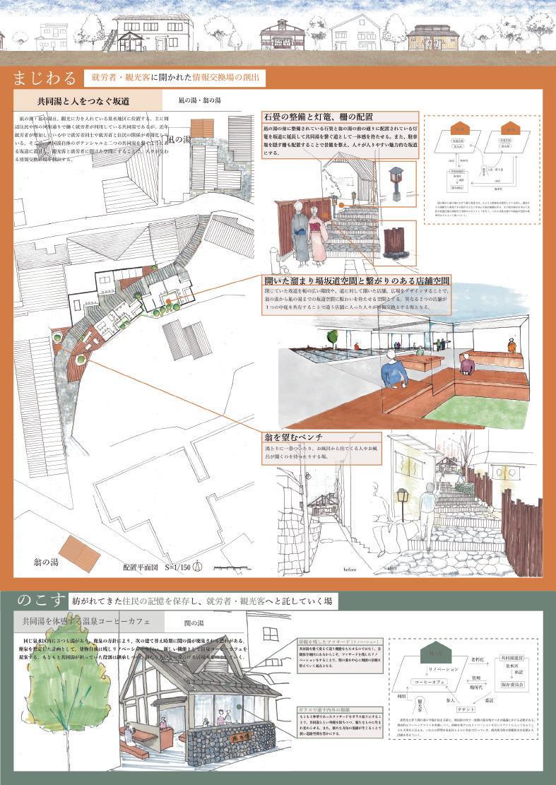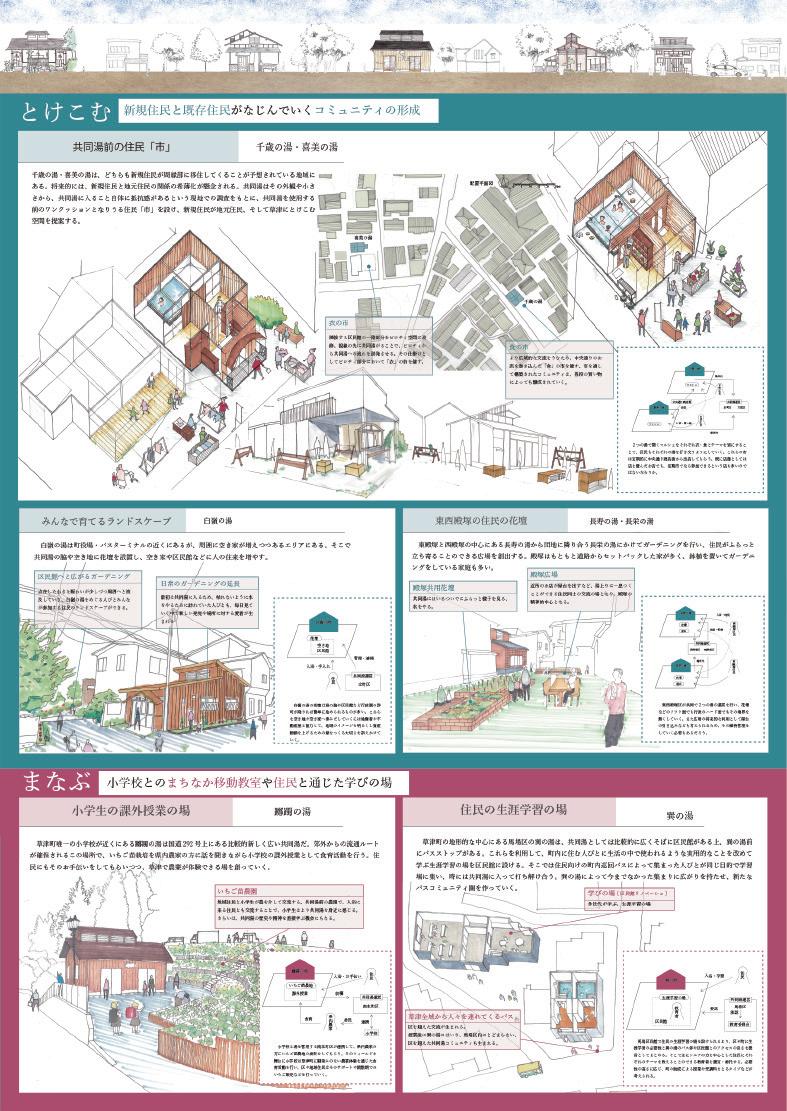 共同湯の再発見——草津のポテンシャルからつむぐ暮らしの未来像 住民にとって生活の一部である共同湯は、観光業の中に 埋もれその魅力を意識されにくかった。私たちはこれを 再発見し、地域住民のコミュニティを強化する糸口とし た。そこでは新たな人びとが原動力となり、共同湯を中 心とした地区を超えた繋がりをつむいでいく。