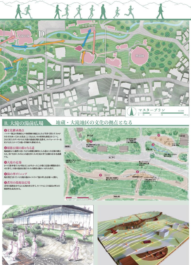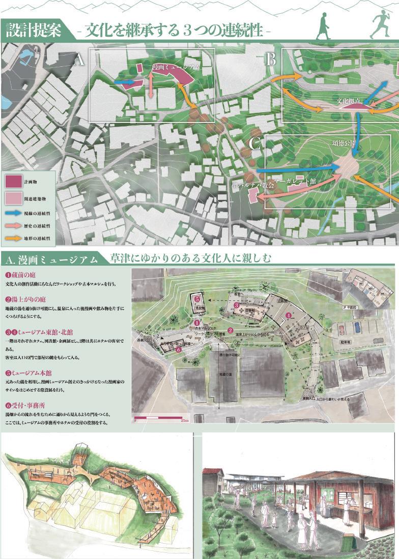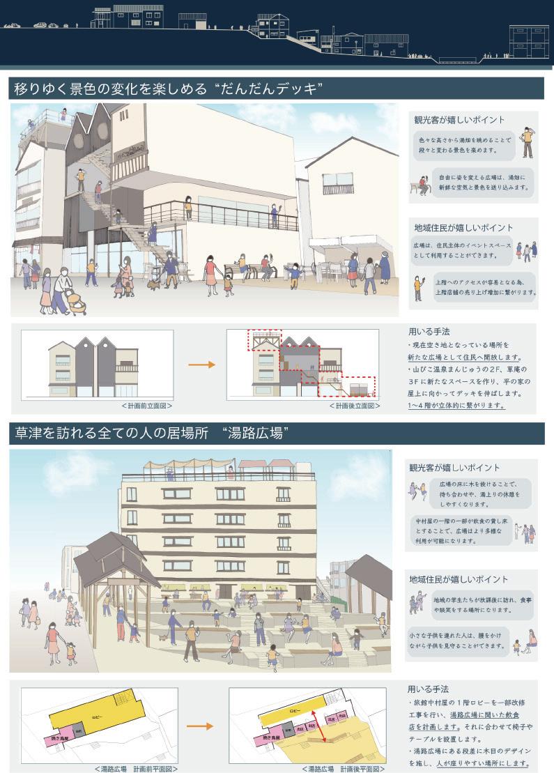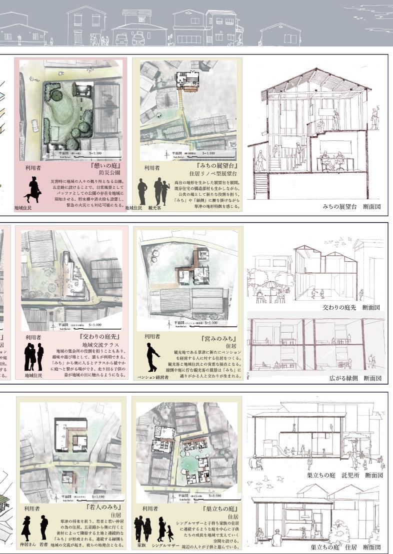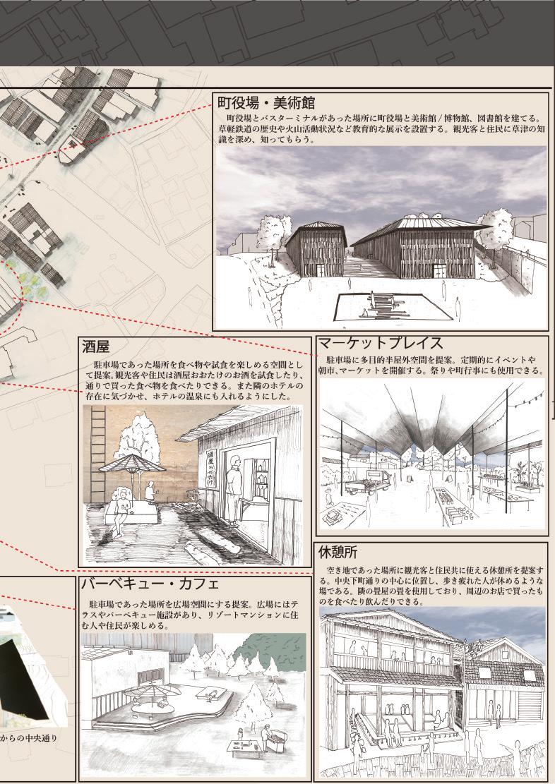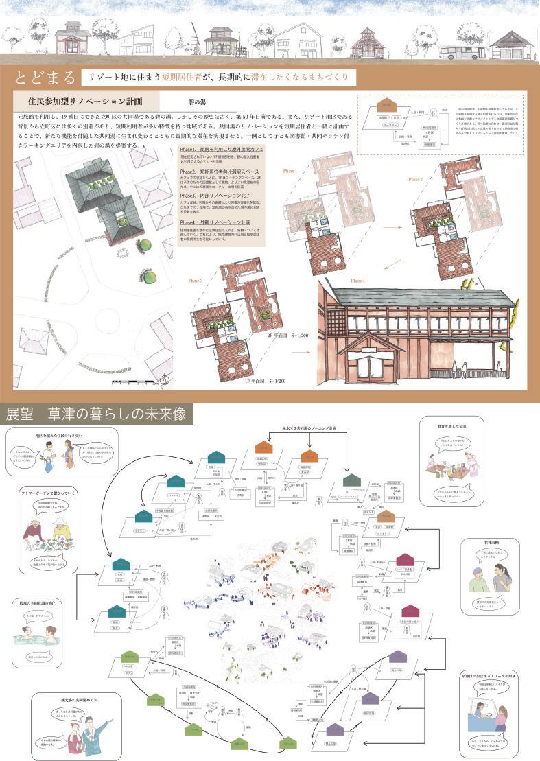 有賀 個別のプロジェクトの場所や設計 意図は説明されているが、最初の住民の 行動分析で草津の町を全体を俯瞰したと ころから、計画の場所選定に入っている という説明が隠れてしまっている。俯瞰 的な視点から個々の提案になったつなげ る説明が必要。