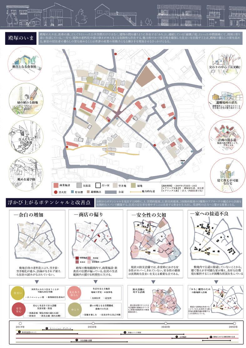 ——殿塚には路地の魅力があるので、そ の道の幅員を広げるのではなく、路地の 裏にある道を公道とみなし、そのネット ワークを充実させることで緊急車両が通 れるようにする。計画の主体は行政と考 えている。