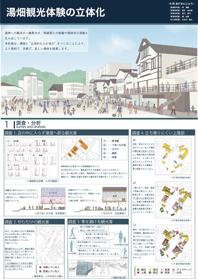 4月下旬に、草津温泉で五日間の現地合宿を行いました。期間中は、3~4名のグループに分かれて、 現地調査、共同作業、テーマ設定を行い、その成果を地域の方々に発表しました。その後大学にその成果 を持ち帰ってさらに発展させてまとめ直し、6月初旬の学内発表会を経て、6月末にふたたび現地にて地 域の方々に提案を発表しました。