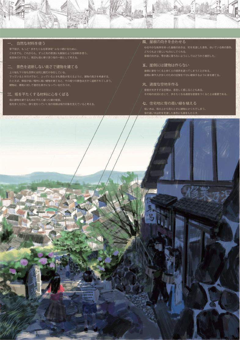 三島 印象に残る絵だったが、もっと提 案を要約して表現する絵を描いて欲しい。 これを見て地元の人が草津だと思えるこ とが大事。「草津5大坂」は、写真などを 入れて地元の人がパッとわかるようにし たい。あと、「知恵」という言葉が引っか かる。意図されて造られた坂ではなく、 みんなが良いと思った坂の要素を取り出 しているのが現状である。「坂の駅」とい うアイディアは面白い。「桶ーション」も 面白いし、さらに広がる提案であると思 う。