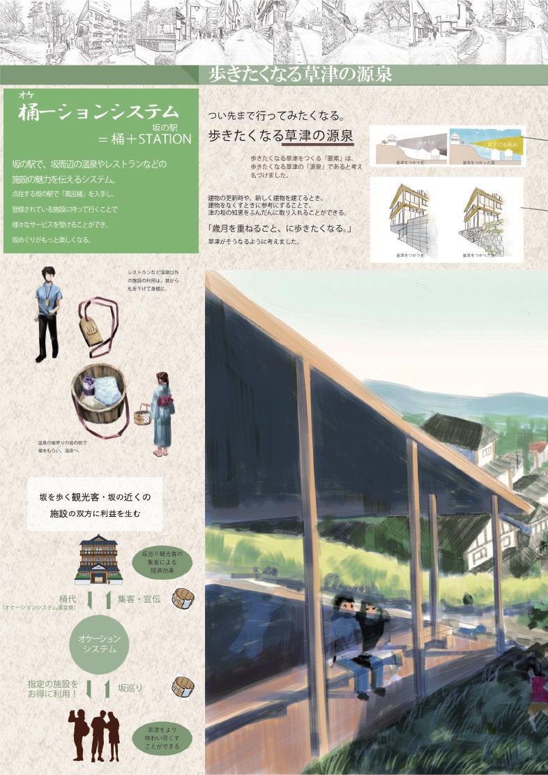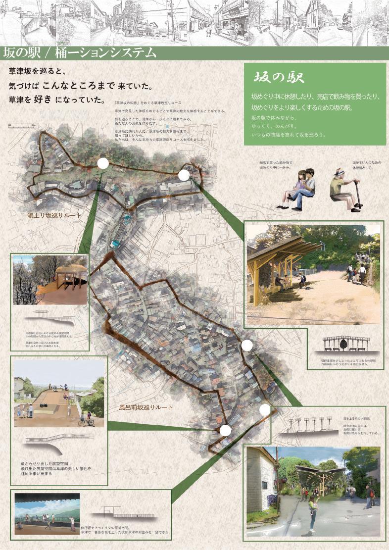 草津は山間部に位置しており、多くの坂がある。そ の中でも特に歩きたくなる坂から学ぶ魅力のキー ワード「草津坂の知恵」を元に、①現在ある坂を観光 資源として活用する、②坂を起点とした将来の草津を よりよくする、という2つの提案を行う。