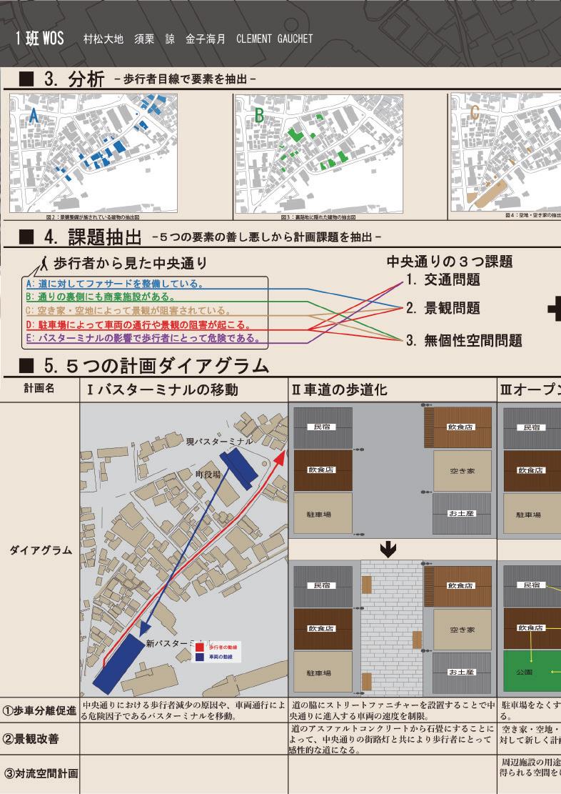 三島 提案はわかりやすく、絵も綺麗に 仕上がっていて完成度が高い。その上で、 現地発表に向けてのアドバイス。まず1 点目は色々なプロジェクトを誰が行うの かということを整理できるのではないか。 行政・民間が主体のプロジェクト、観光 客が参加するプロジェクトなど、誰がや るのかということを意識して追加情報を 提供するとよい。また、回遊性モデルに ついては、その導入前後の様子をちゃん と示した方が良い。バスターミナルを坂 の上にもっていくのは歩きやすくなるし、 良いと思う。もう一つ追加できるとした ら、バスターミナルに帰っていくときの 工夫。行くときと帰るときでどのように 印象が変わるか。こんな魅力があるから 上り坂もつらくないなどの工夫があれば さらに厚みが増してくる。雪のときどう するかなど、季節ごとの工夫ももたせる といい。最後に、リノベーションも視野 に入れると良い。コストも少なくてすむ。