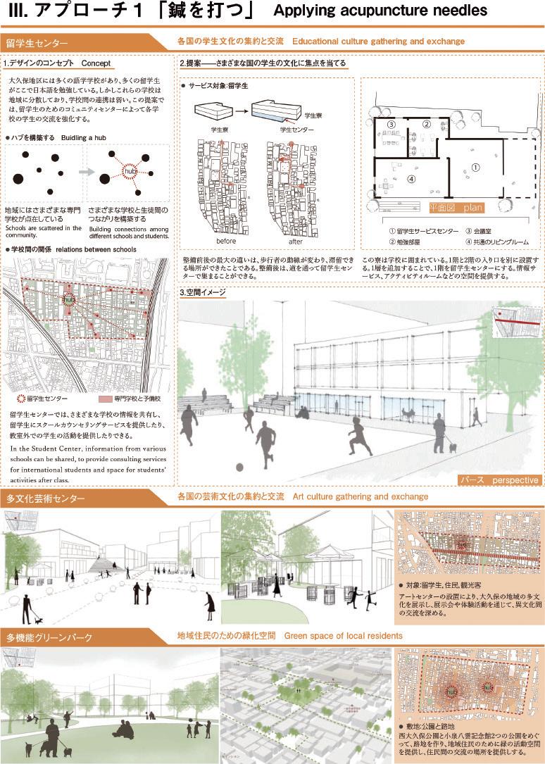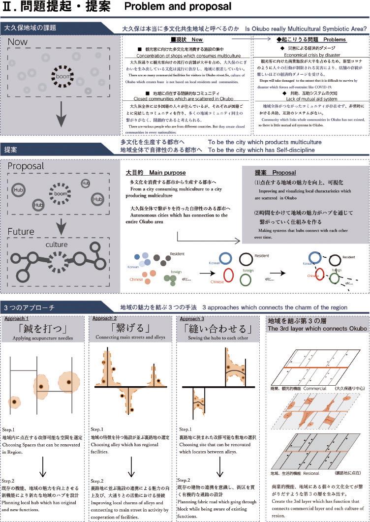 稲葉 大久保の魅力は、非常にちまちま コマコマした街路と敷地の中でいろんな 文化を持つ人たちがそれぞれの思うよう にやってるというところだ。ある意味で 計画がないから面白という話だが、そこ に今回皆さんはなんらかの計画を持ち込 むということだったため、興味深く拝見 した。一つ目は、まさに大久保は消費さ れる街になっていて今のままではいけな いと思うが、発表を見ると観光客を非常 に肯定的に捉えている。大久保に古くか ら住んでいる住民にとっては観光客こそ ニューカマーで、よくある住民と観光地 の中の軋轢がある。どうしてももともと 住宅地だったので、トイレもないし、ゴ ミを捨てる場所もない。そういう中で住 民と観光をどういう関係にしていくのか、 難しい課題だと思う。多文化共生ってい う言葉、多文化の空間、この多文化とは そもそもどういう状態なのか。多文化の それぞれの主体がどういうふうに想定さ れているのか。