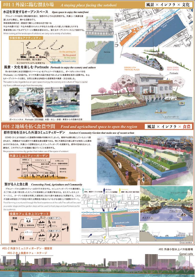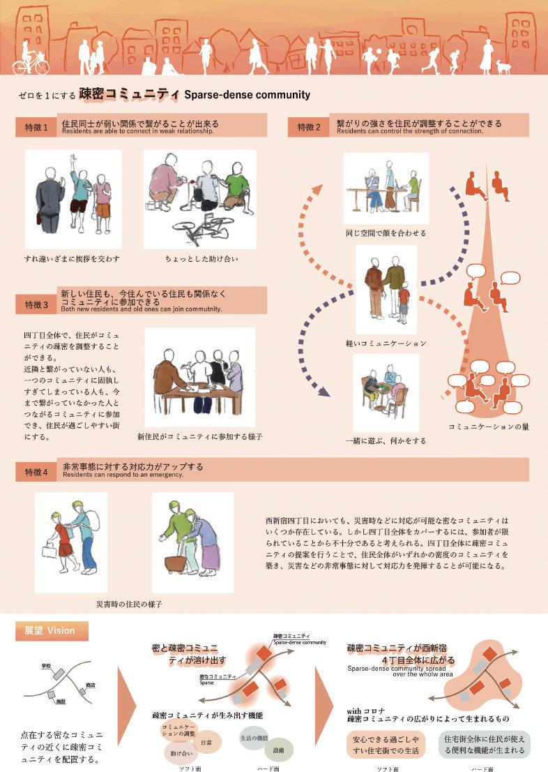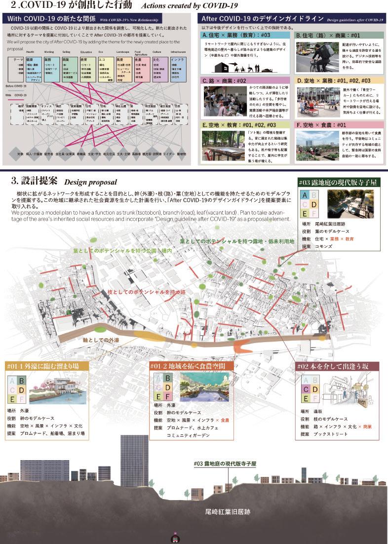 1~3はコントロールやマネジメント をしようとしている。ですから、言葉が とても大切なんだろうと思う。「疎密コ ミュニティ」「気配」「unknown」という 言葉を使っている。チームの中で共有で きる概念までは発達したのだと思うが、 まだ初耳の人には伝わりにくい。そうな ると双方向性というものが重要になって きて、伝え方も直接話法で伝えるのでは なくて、隠喩のような方法で伝えていか なくては、都市空間の中ではノイズになっ てきてしまうだろうと感じた。4~6は既 成の空間に新しい機能をインフィルする、 それが「共創磁場」や大久保の学校、ゴー ルデン街の子供食堂などをやってくれた のだと思う。7~9はネットワーク、水 辺や地下空間、路地空間をつないでいこ うという案だった。その中で一本取られ たなというのが、7グループの外濠のボー トが浮かんでいる絵だった。アフターコ ロナとはこういう景色なんだろうと思わ された。ボートに乗る2人は親密なのだ けれども、周りからは一定の距離をとっ ている。何かこれまで見てこなかったア フターコロナの世界を垣間見させてくれ たのがこの一枚のパースだったと思う。 さっき稲葉さんが「計画されないから 面白い」と言われて、そうする都市計画 はいらなくなっちゃうなと思ってしまう けれども、そうではなくて余白をどうやっ て設計していくか、ということに我々の 仕事の領域が変わってきているのではな いかと思う。2メートルという物理的距離 をとるという密度のコントロールの仕方 が従来のプランニングだったのだと思う が、ソーシャルディスタンスというのは 我々計画者が計画しなければいけない。 社会空間が我々の計画の対象になってき ている。そうなると佐藤先生のおっしゃ るように、タンジブルな表現で物理的な 空間を提案するだけではダメで、インタ ンジブルな手法をもってソーシャルなス ペースを合わせて提案していかないと、 我々も社会の変化についていけないので はないかと感じた。