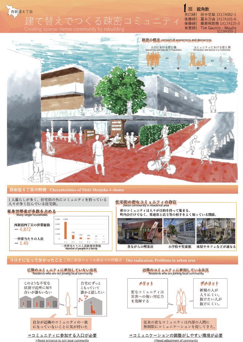演習期間中は、4名ずつのグループに分かれて、テーマ設定、調査、作業を行い、最終的にはその成果 を新宿区をはじめ地域に関係する方々に発表しました。新型コロナウィルス感染症の流行に伴い、授業の 開講が約1か月遅れたことで、例年の15回構成から12回構成に短縮されましたが、質の高い提案に結び 付けられるように「補講」を設けるなど工夫しました。