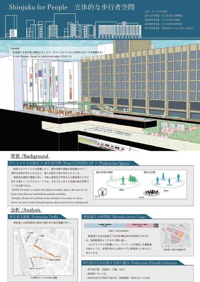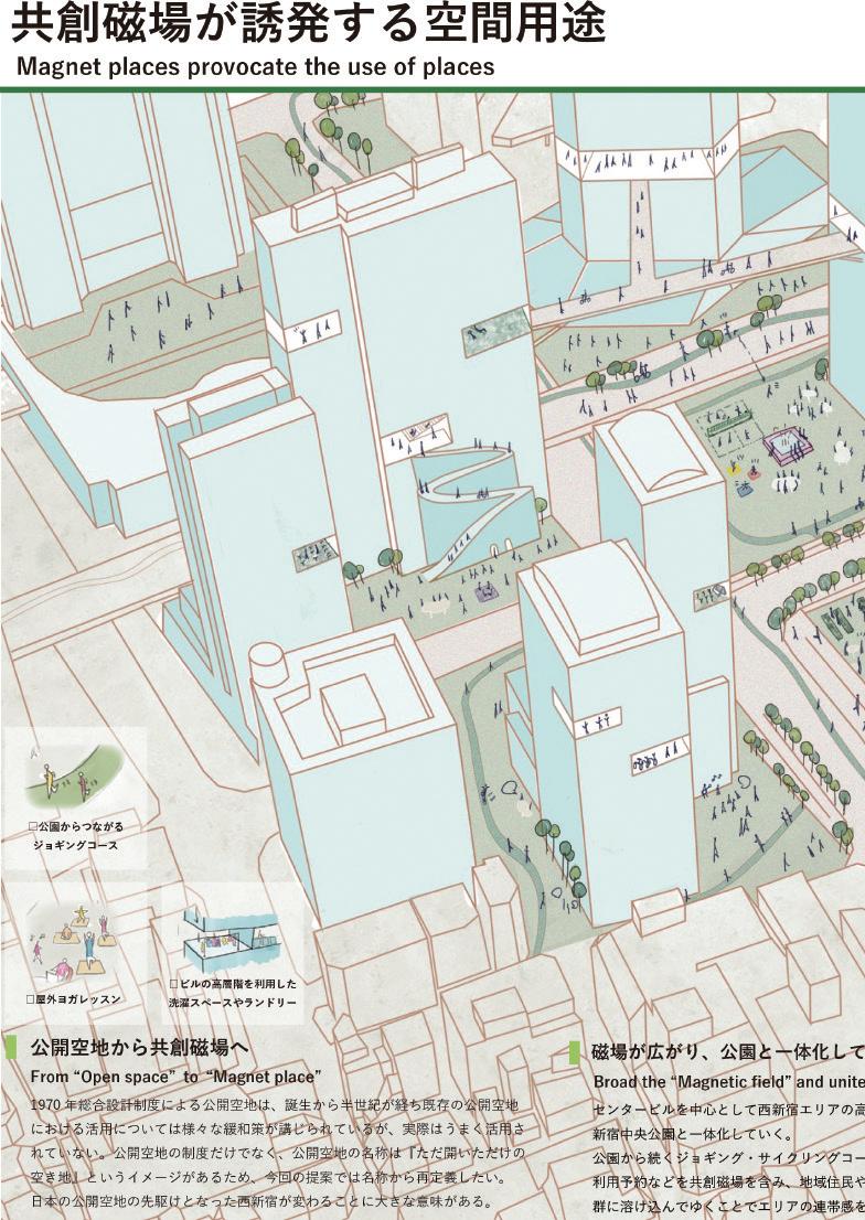 新宿区 ビルの1階部分と歩道部分をコ ネクトするような提案がされているが、 新宿区でも歩道の社会実験をしている。 それがうまくいっていないからこそテナ ント部分との連動が必要だと思われてい るのだろうか。今の新宿のやり方ではい けないという部分を教えてもらえないか。 ——1階部分を繋げるということについて は、区の取り組みだけではなく、民間の 取り組みがあることで、例えば1階部分 を拡張した部分で得た賃料等、エリアで 得た利益を民間が取得するのに対し、区 は流れてくる人の量の多さの利益で活性 化していくというように、民間と行政が 関わることでできることがあるのではな いかという発想からこのような提案をし た。