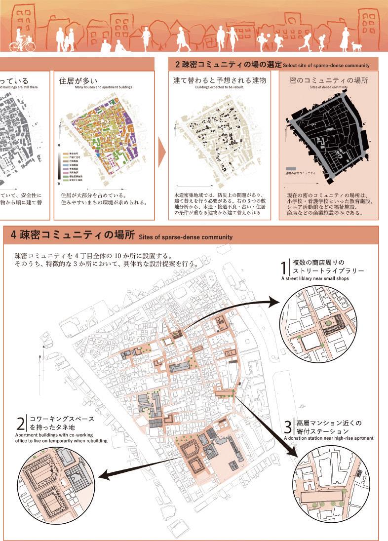 ——ソフト面について、例えばストリー トライブラリーの提案では、つながりを 調整できる機能として、蔵書を訪れた人 が自由に交換できるということを考えて いる。その際、自身が興味のある本を一 人黙々と読むように、さほど人と関わら ずに済むコミュニティを維持するという こともできるし、自分の興味のあるジャ ンルを読んでいる他の人や、まだ読んだ ことのないジャンルの本を持っている人 と積極的にコミュニティを作ることもで きる。コミュニティを作ることも作らな いこともできる空間として提案した。