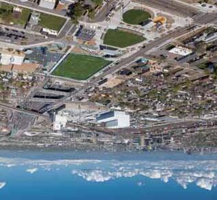 Pic 1-1) A large street facing the stadium and various public facilities. The sidewalks seem too wide.