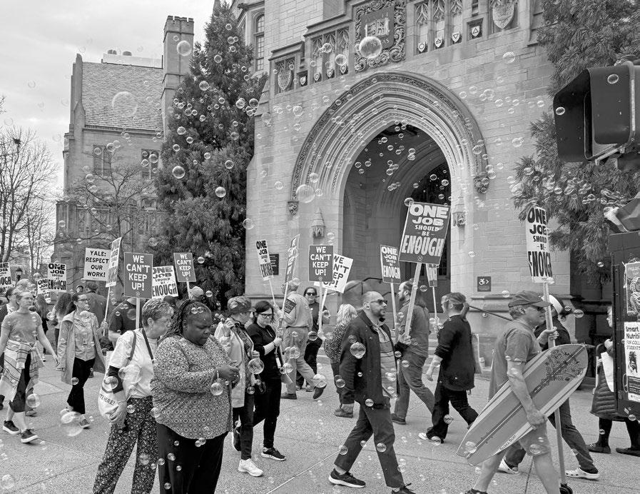 Bubbles, rally cries and handmade signs floated down Grove and Prospect Streets on Wednesday afternoon as members of UNITE HERE Local 34, Yale’s union of clerical and technical workers, surrounded Sheffield-Sterling-Strathcona Hall to demand a contract that accommodates the rising costs of living for workers. The demonstration — which was made up of roughly 750 participants, Local 34 communications director Ian Dunn estimated — is the most recent in a series of protests the union has held during its ongoing contract negotiations with the University.