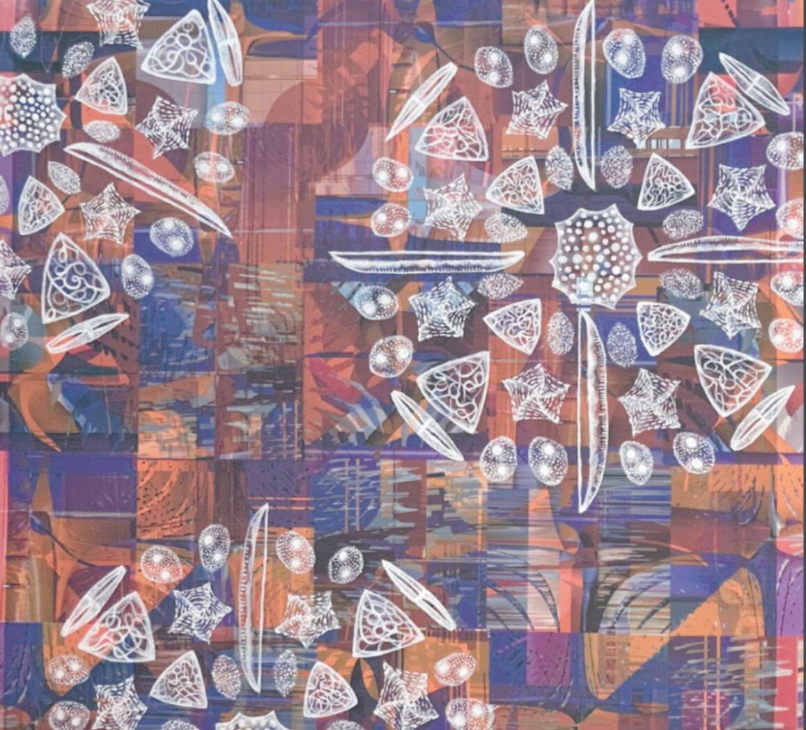 Her presentation focused primarily on “Diatom Mandala,” the piece she had built by generating forms in Desmos, collaging them in Procreate, printing the composition onto a linen canvas and drawing diatoms herself with a white paint and a toothpick. But the talk expanded beyond “Diatom Mandala.” Miinea also discussed “Evolving Gossamer,” a virtual reality piece