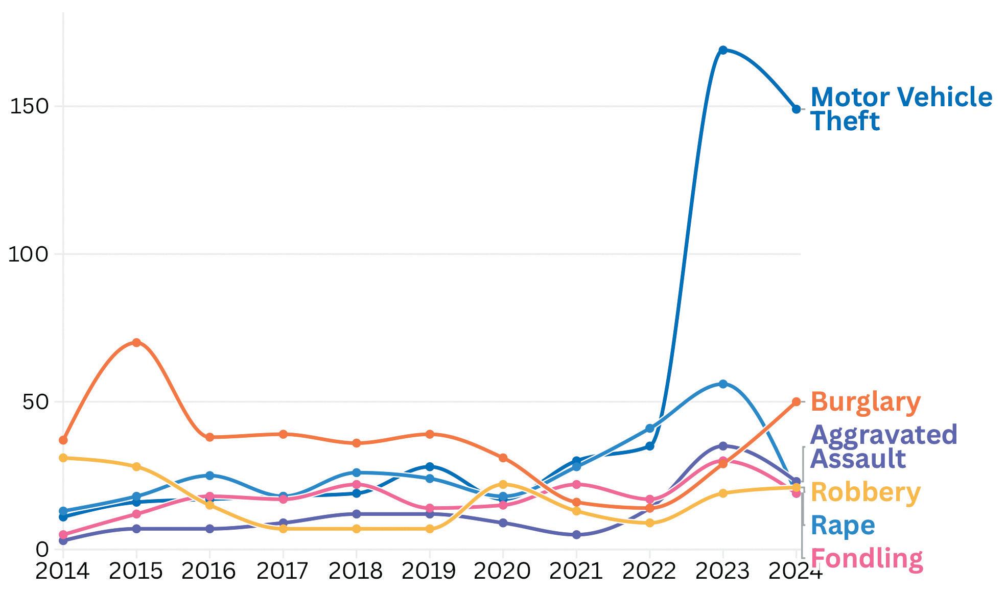 In 2024, there was a decrease in reported sexual violence and rape from an almost decade high in 2023. In 2024, Yale Public Safety recorded 19 instances of reports of rape, a decrease from 56 reports in 2023. According to a footnote in the security report, the data is narrower