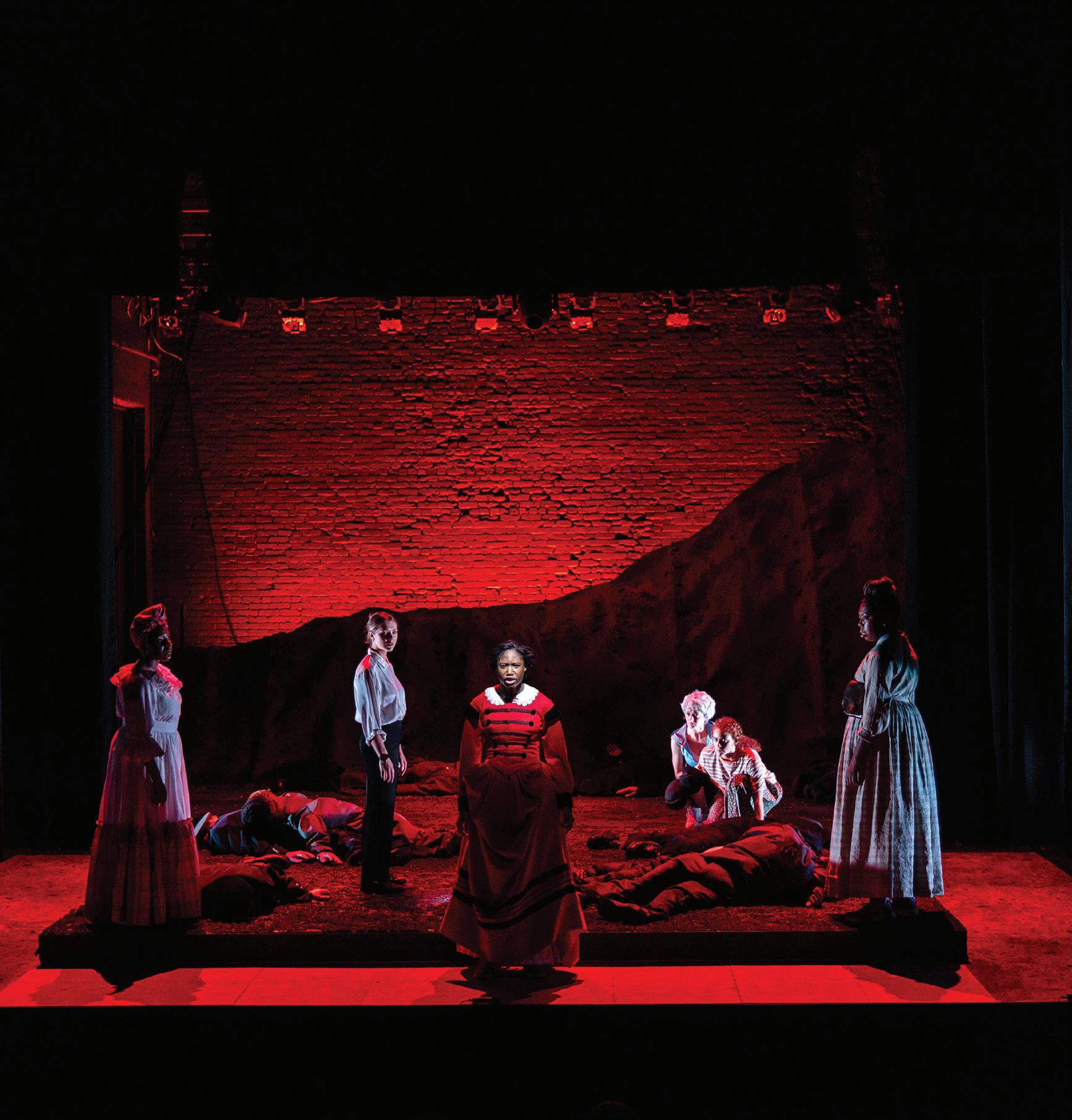 ABOVE: Abigail C. Onwunali ’23, Rebeca Robles ’24, Tyler Cruz ’23, Karen Killeen ’24, Giovanna Drummond ’24, and Whitney Andrews ’24 in Marys Seacole by Jackie Sibblies Drury, directed by Leyla Levi ’23. Photo © T. Charles Erickson.