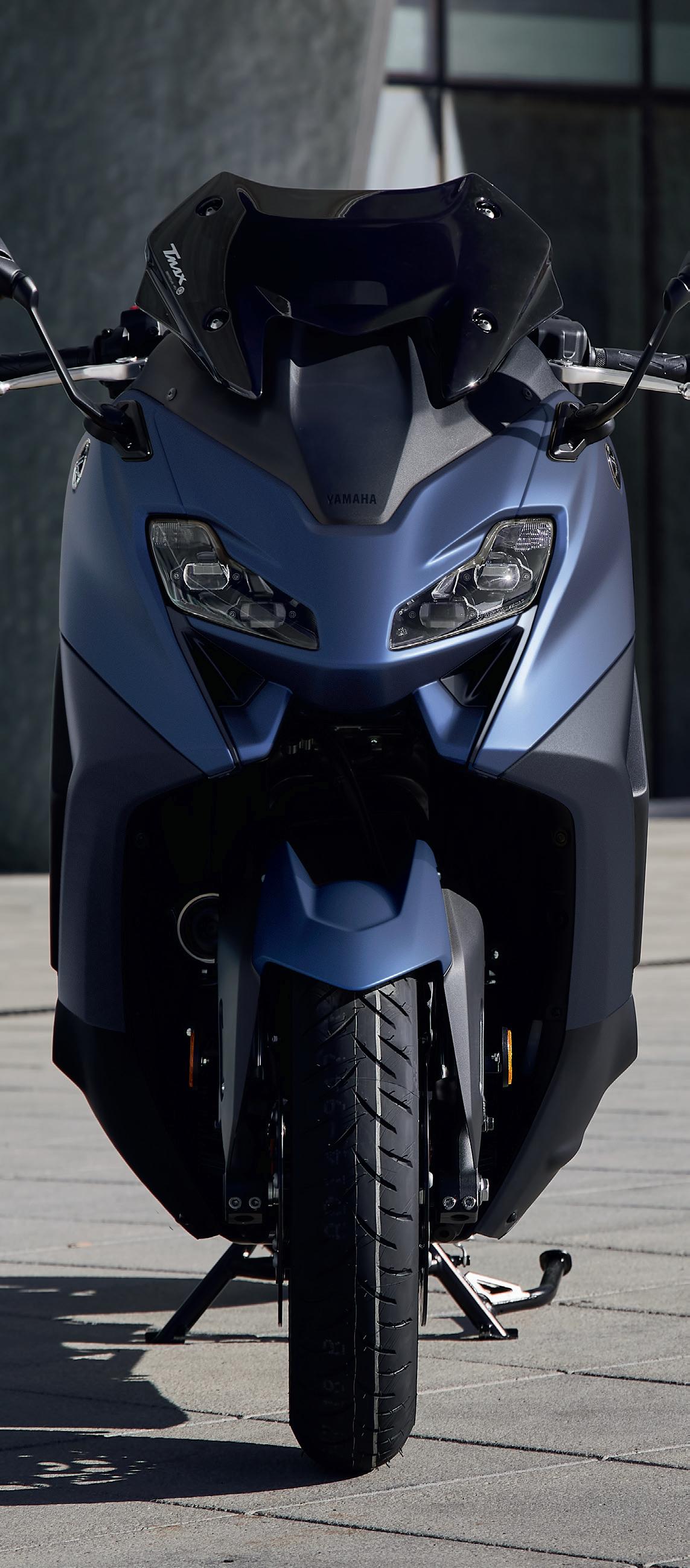 Le TMAX se rapproche encore un peu plus de l’univers des motos supersport grâce à son habillage aérodynamique. Le double optique à LED plus fin, les flancs avant dotés de grandes admissions d’air, ainsi que les caches « boomerang » font plus que jamais partie de l’ADN de TMAX. Les jantes « Spin Forged » légères et le guidon en aluminium forgé font de ce maxiscooter de sport un véhicule véritablement haut de gamme.