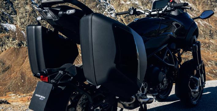 Des valises latérales rigides aux couleurs assorties à la machine sont montées d’origine. Chaque valise peut accueillir un casque intégral et pour une conduite naturelle, les valises sont montées sur un système de fixation flottant. Un top case peut également être installé en option.