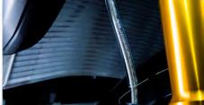 Cette moto sportive épurée, radicale et emblématique, est équipée de suspensions contrôlées électroniquement à six modes développée par Öhlins. En mode semi-actif, l’amortissement est automatiquement ajustée en fonction des conditions de pilotage, ce qui confère plus de précision au châssis lors de phases de freinage, d’accélération et de passage en courbes.