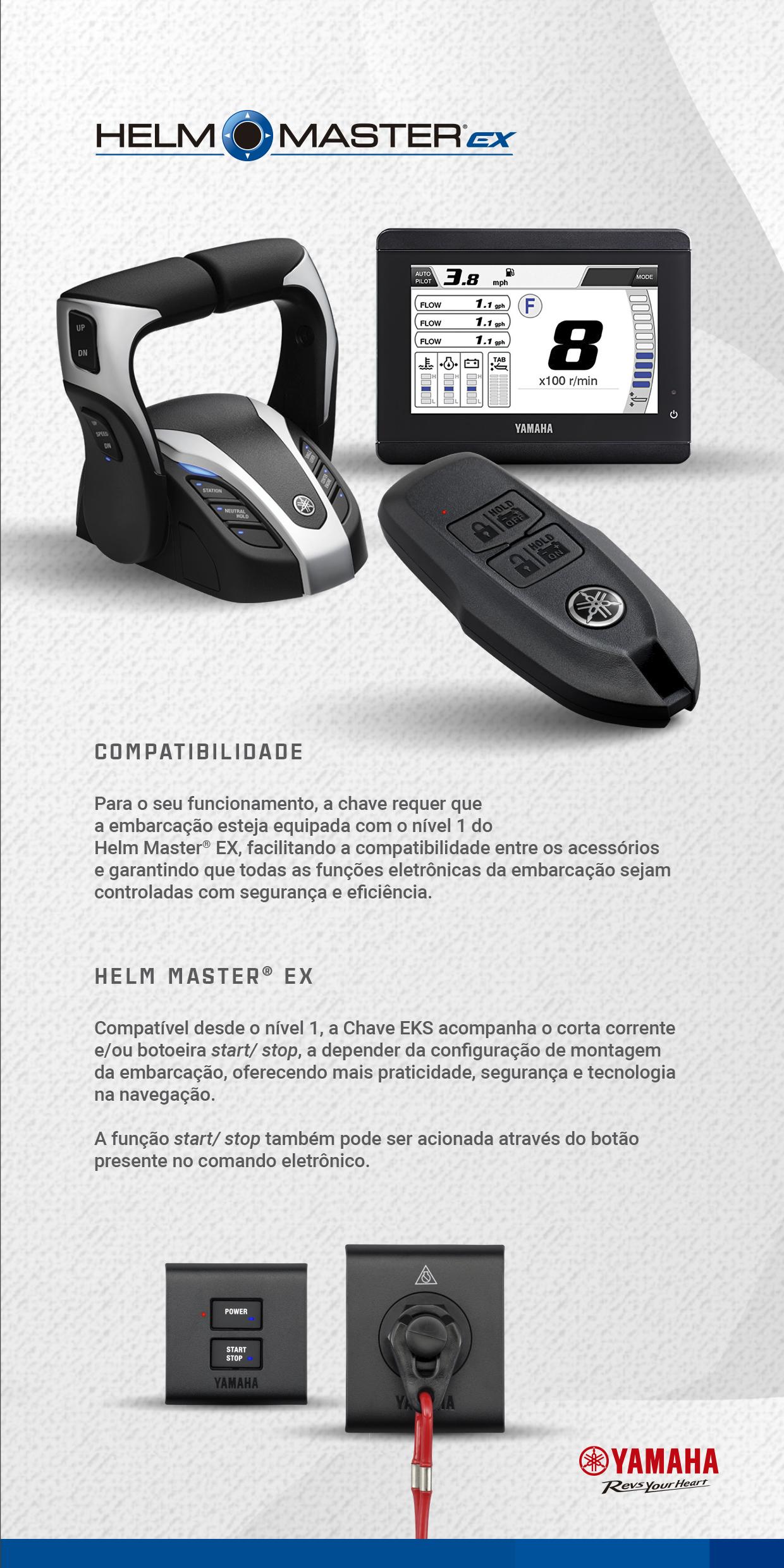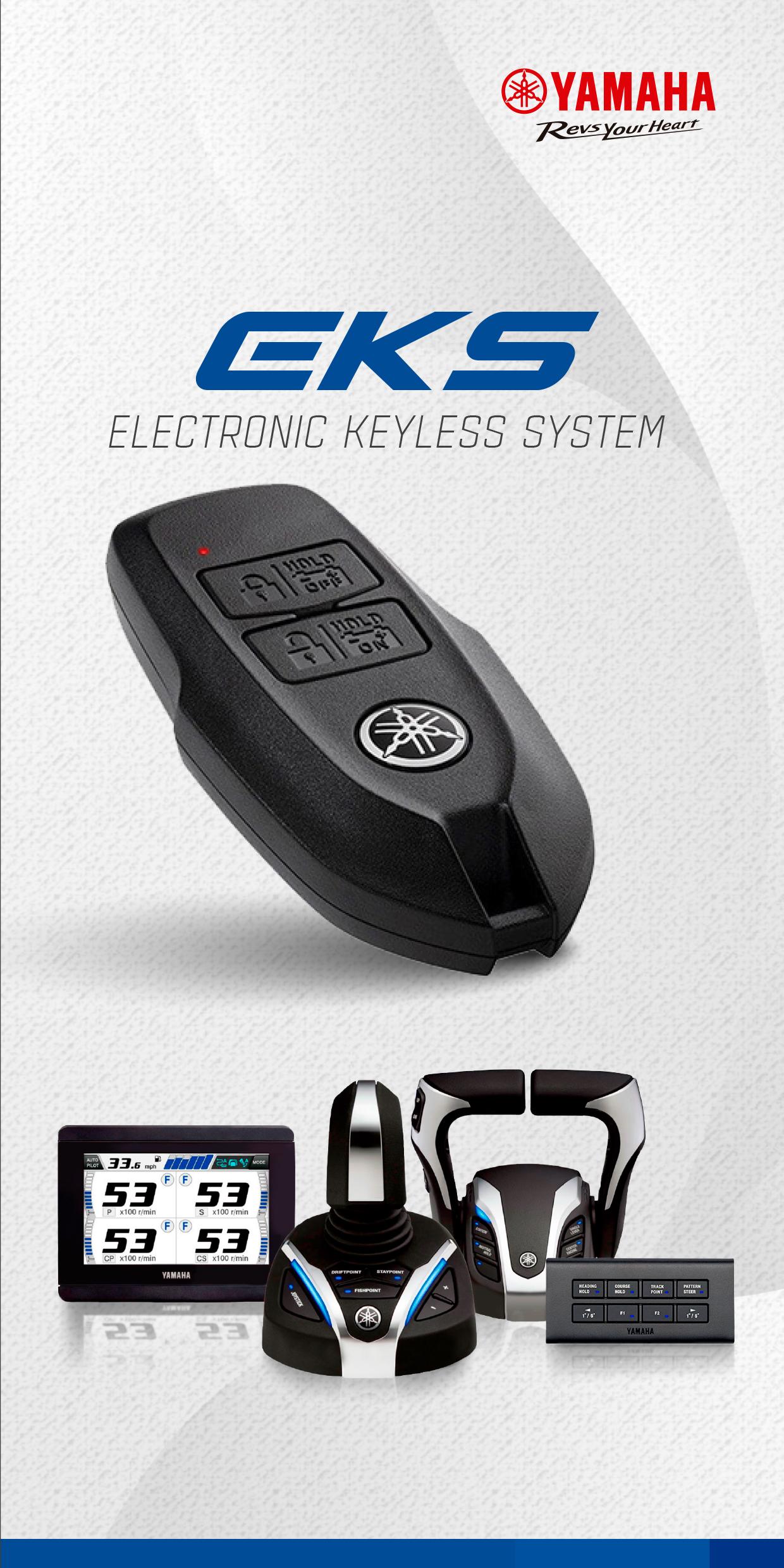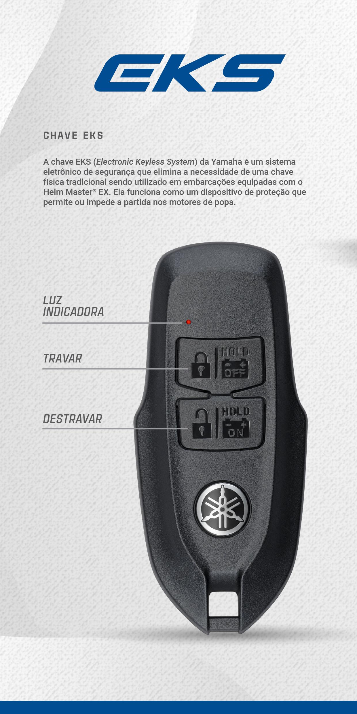 A Chave EKS oferece funcionalidades como travar/destravar o sistema e controlar a alimentação elétrica da embarcação. Ela permite energizar o sistema a distância e, em conjunto com a botoeira start/stop, proporciona ao usuário a comodidade de dar partida sem a necessidade de girar uma chave mecânica no console. A uma distância de até 5 metros, o usuário pode simplesmente pressionar um botão para destravar o sistema Y-COP™* e, em seguida ligar os motores, de maneira segura, simples e rápida.