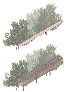 The design uses terraces to handle the sixmeter height difference between the main road and the stream. The productive landscape is therefore integrated into the site naturally, meanwhile decreasing soil erosion on the slope. Elevated viewing trails and trails by water provide observation from different angles and heights respectively.
