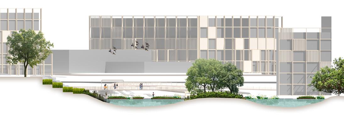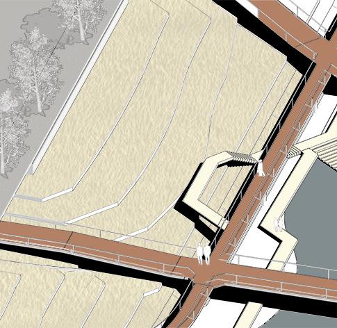 Teaching Area Teaching Area Living Area Living Area Living Area Sports Field Living Area to E. Gate ▶ to S. Gate▼ SECTION A SECTION B SECTION C Dormitory LEGEND Parking Field Underground Passage Scooters Parking Field Canteen Library Green Roof Productive Garden Public Square Streambank Footpath Viewing Bridge Wetland Footpath Pavilion Waterborne River Crossing Terrace Field Floating Islands River Islet Orchard Field Flower Field Wetland Paddy Field Fram Paths River Crossing Bridge 1 1 1 1 1 1 1 1 1 1 1 1 1 1 1 1 1 1 2 2 2 2 3 3 4 4 5 5 5 6 6 6 7 7 7 7 7 8 8 8 8 8 8 9 9 9 9 9 9 9 9 9 9 9 10 10 10 11 11 11 11 11 12 12 12 12 12 12 12 13 13 14 14 14 14 14 15 15 15 15 15 15 15 15 15 15 16 16 16 16 16 17 17 17 17 17 18 18 18 19 19 19 19 19 21 21 21 21 21 21 23 23 23 23 23 23 24 24 20 20 20 20 20 20 20 20 20 22 22 Master Plan Explosive View The site is located on the campus of the China University of Mining & Technology, in the city of Xuzhou, as the city is undergoing a massive transformation from a resource-dependent (mainly Mining, obviously) city to a green city that fits a sustainable future. The site is mainly dived by a creek into two separate parts, Living Area to the West, and Teaching Area to the East. Such an arrangement resulted in massive crowds traveling between the areas during peak hours. Multiple creek crossings are designed to arrange the crowds. The difference in height reaches a maximum of 6 meters between two creekbanks, which had long suffered from erosion due to steep slopes. Terraced Fields are introduced on the creekbank as a method to solve the issue. Green Roofs and vertical greening are introduced in the design to further create an eco-sustainable campus. Large experimental fields, as well as rather small gardens, are set to bring productive landscapes to campus. Streambank Footpath Farmlands Farmlands Woodland Wetland Pedestrains Space River Crossing Viewing Bridges Viewing Platforms Pavilions Sidewalks Sidewalks Waterborne River Crossing Farm Tracks & Viewing Platforms Agricultural Distribution System Green Roofs Courtyards Roadway Function Pavements Minor Paths Landuse Living Areas Teaching Areas Greenland 50m N