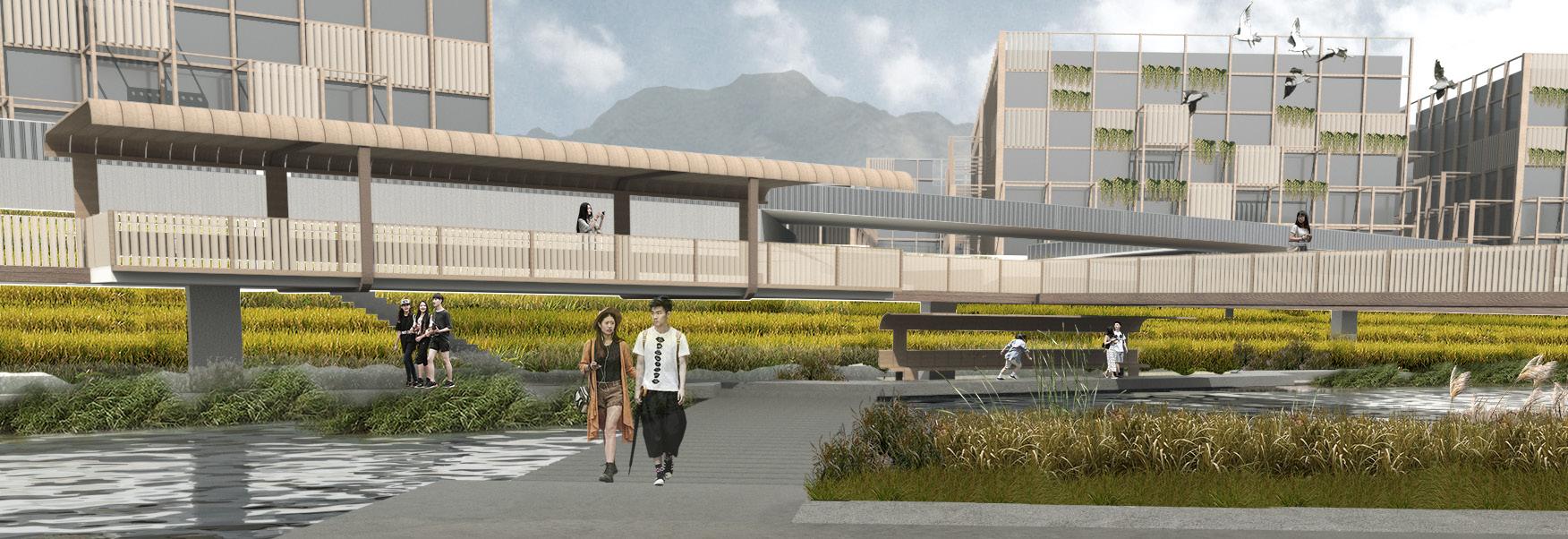 The design makes use the lawn on the east of teaching area to set up an experimental field area, echoing the theme of design to explore the reproduction of agricultural landscapes in urbanized public areas such as campuses. Viewing trails are set above the rice paddy to connect two sides, while there is also viewing platforms that overlooks field. The square carries massive flows of people during peak hours. The design depresses pedestrian walks under main roads at the cross, avoiding conflicts between the flow of people and the flow of vehicles. At the same time, the design also established an enveloping structure on the outside of the canteen building to make its overall shape more consistent with the site as a whole, while also providing more spaces for vertical greening. The river has a larger width at the southern end of the site and runs around the island in the middle of the river. This area is largely ignored under current consideration. This design connects two banks of the river with the island in the center of the lake ecologically through the ecoartificial floating islands, creating a complete wetland space.