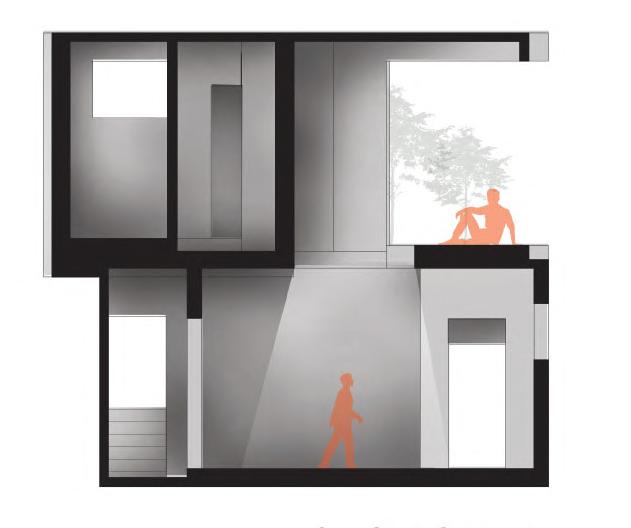 Opening in wall 3 creates an internal threshold through the space, which is strengthened by the raised platform below. Opening also conveys a sense of bigger space, while placed parallel to the appendage behind to connect to the outside.