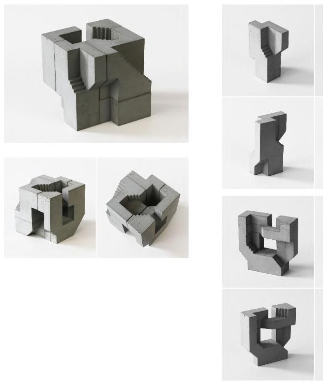 Pieces are assembled to form a central void, where the varied heights of the pieces create a sense of hierarchy.