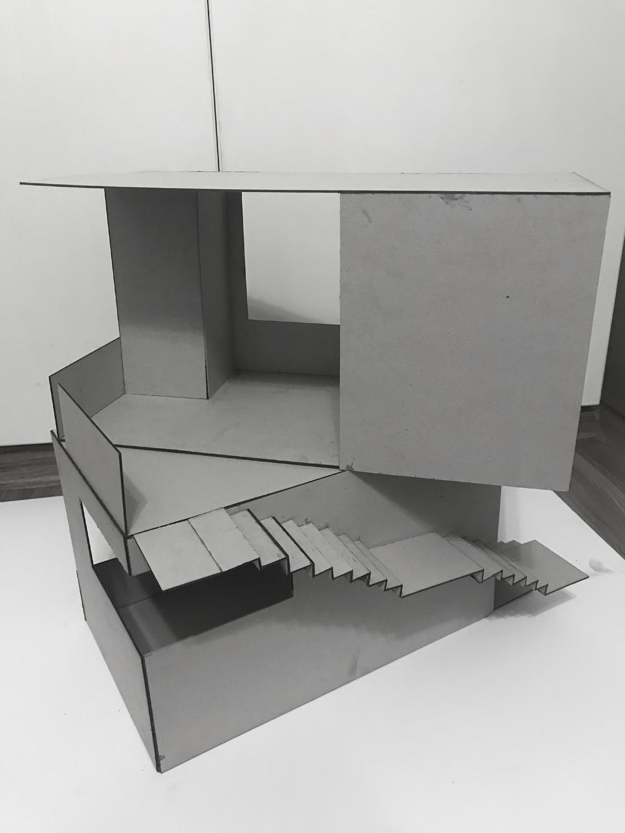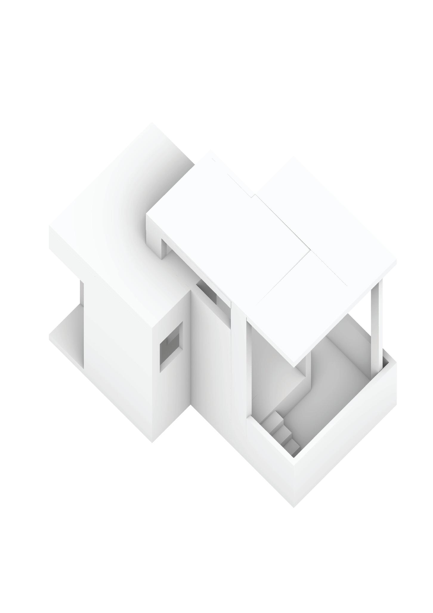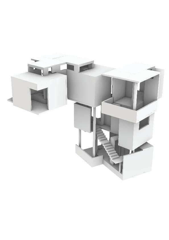 Two-cube units are further combined to form a four-cube apartment analogue, where connection via an oblique axis is being explored. By placing a two-cube unit over the other from a pivot point, the rotated analogue results in the creation of interesting spaces. Such spaces include shelters made from the overhangs in the rotated second level together with a balcony space on the roof of the first storey. The main staircase is built from the inside and continues to the exterior, where it leads up to the balcony. This allows the viewer to experience simulataneous qualities of the interior and exterior as he circulates through the staircase.