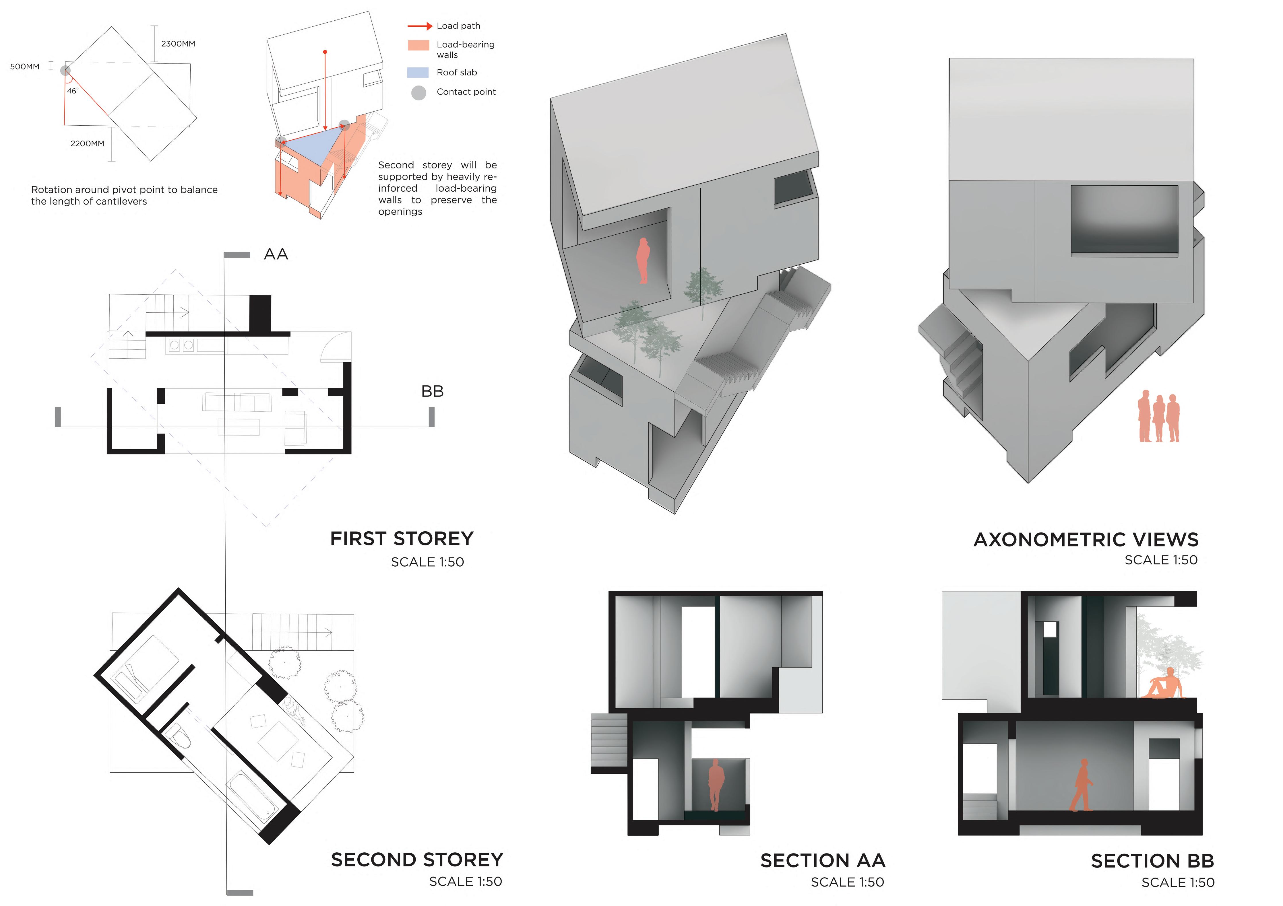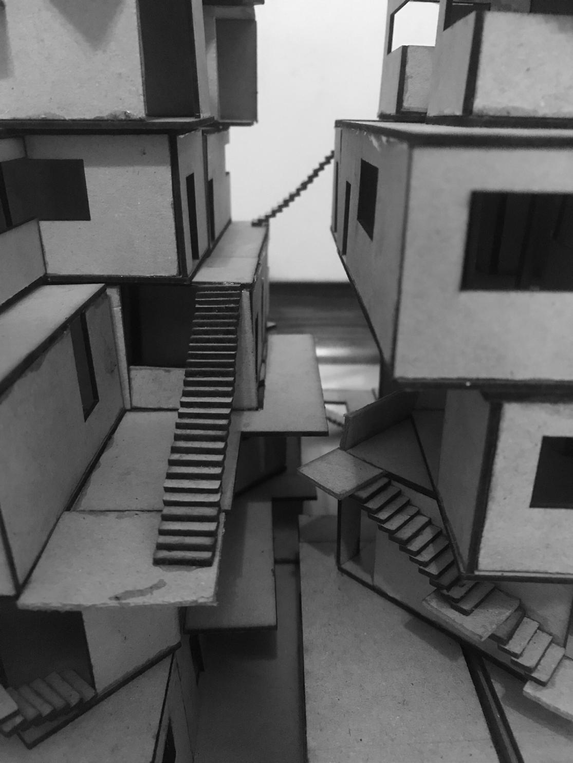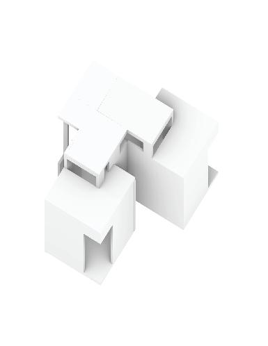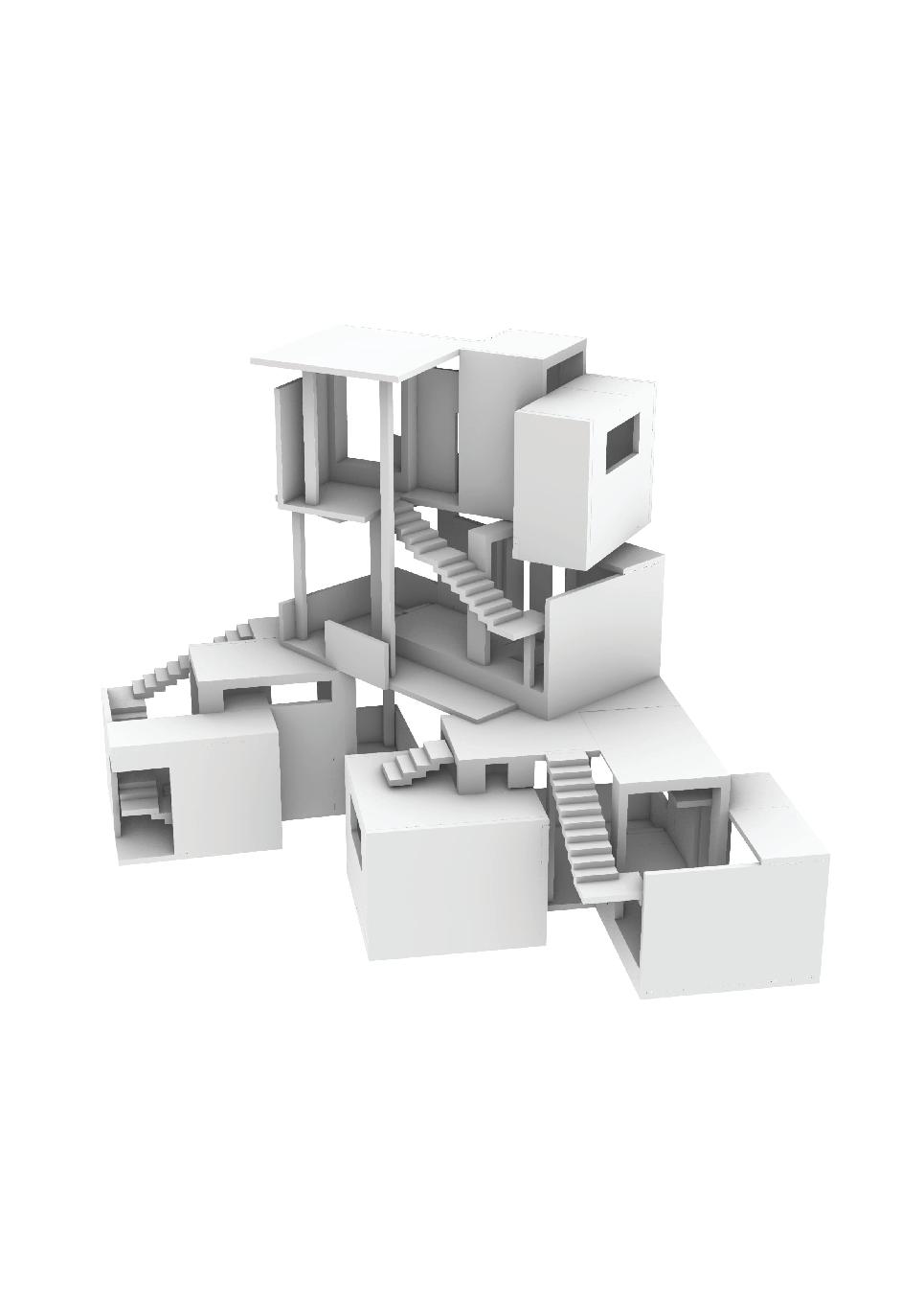 Two-cube units are further combined to form a four-cube apartment analogue, where connection via an oblique axis is being explored. By placing a two-cube unit over the other from a pivot point, the rotated analogue results in the creation of interesting spaces. Such spaces include shelters made from the overhangs in the rotated second level together with a balcony space on the roof of the first storey. The main staircase is built from the inside and continues to the exterior, where it leads up to the balcony. This allows the viewer to experience simulataneous qualities of the interior and exterior as he circulates through the staircase.