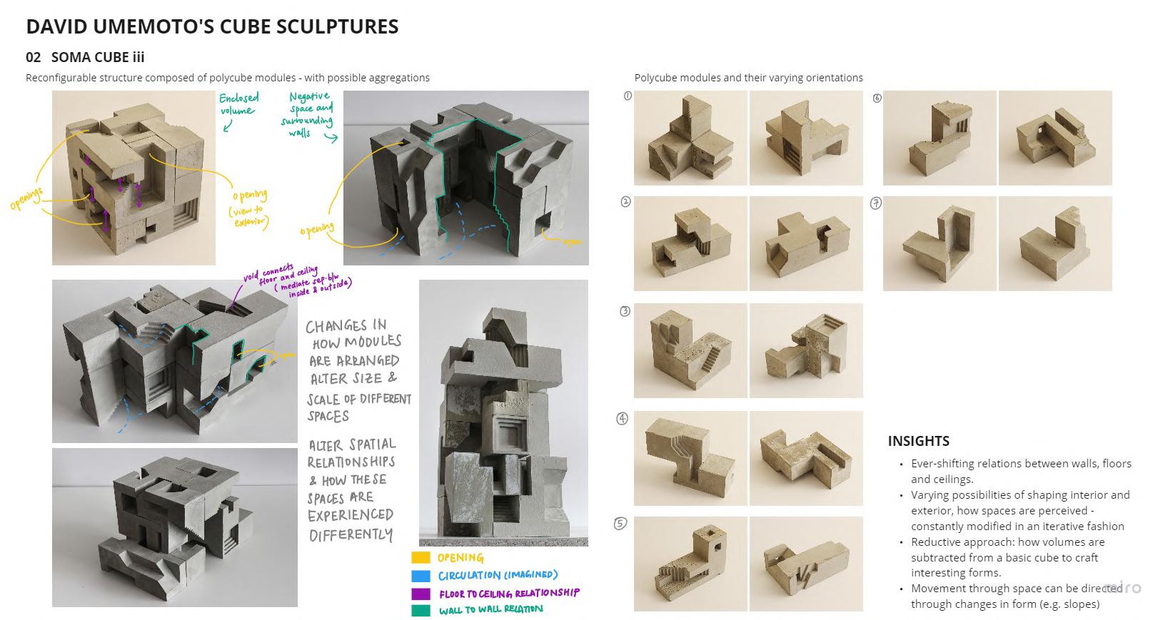 The first stage involves an interpretation of abstract spaces in Umemoto’s sculptures. The chosen sculptures below highlighted how interior spaces and facades are made through the combination of discrete pieces. Umemoto’s sculptures are interpreted into an operated cube of 4x4x4m for each sculpture, where a first attempt is made to