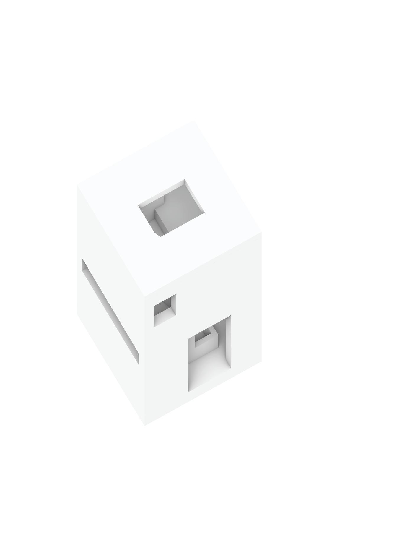 Floors and levels are isolated from one another in the analogue design in stage 5, where there is a lack of vertical relationship. Design of the analogue is modified to include a void that connects vertical spaces together. In view of structural considerations upon aggregation, the base of the analogue has to be simplified, departing from the sculptural qualities that were previously experimented on.