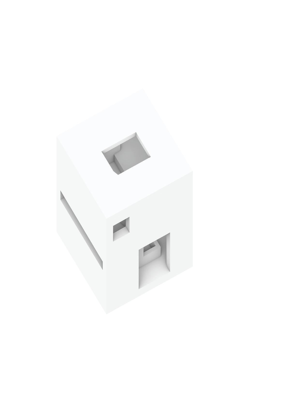 Openings are also varied in scale. In the interior, floors are arranged to form a diagonal void at the centre. Movement through the space is also suggested through the staircase. This cube also marks the beginning of creating an opening in the interior wall to create views across the space.