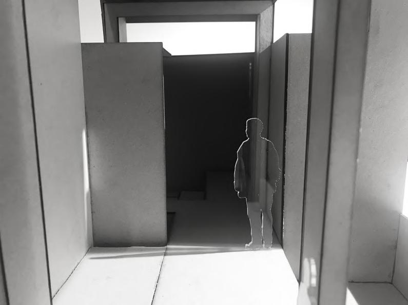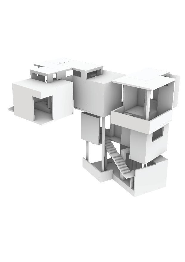 Cubes A and B are combined to form a two-cube unit. Observed in the drawings interior wall with opening is placed in each of the cube. combined for the internal openings to align to each other, estab. This combination marks the beginning , where they form a threshold for the viewer to walk to the open balcony space. A raised platform is also added to further sug-