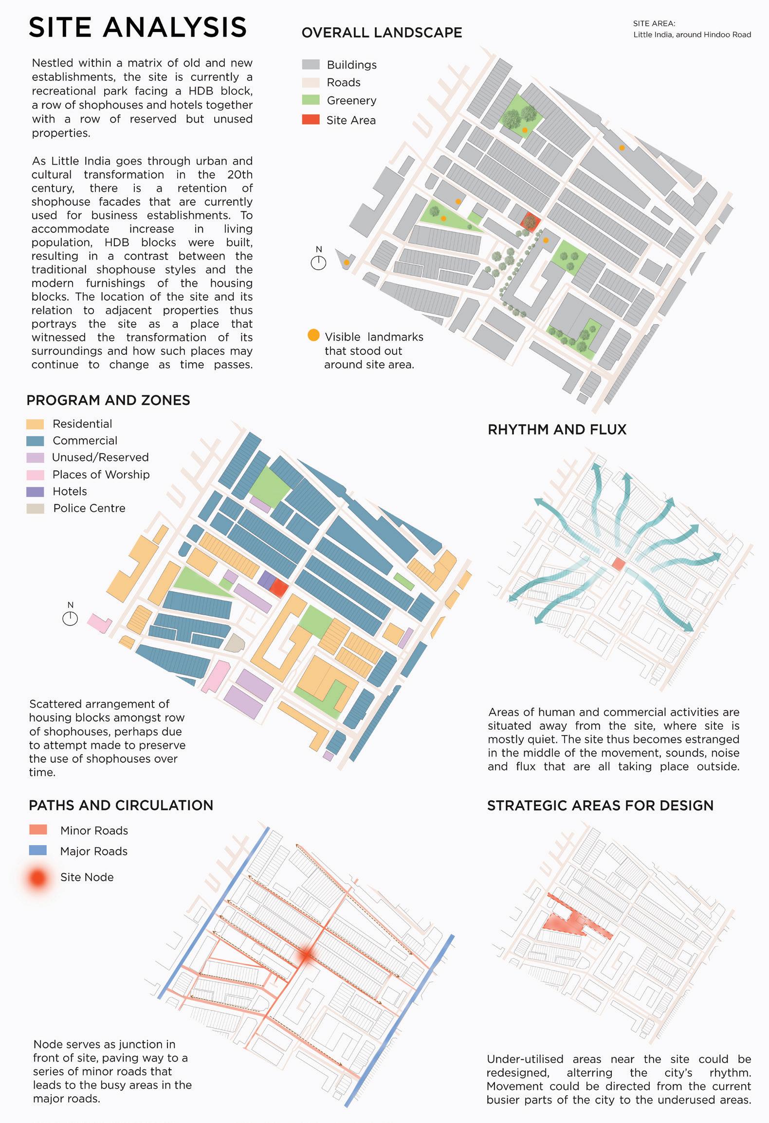 Originating from a shophouse district, Little India has gone through a series of urban transformations. These changes become evident through the emergence of newly built structures like the high-rise HDB that contrast against the preserved low-rise shophouses. The site is thus identified as a place of transition in the evolving urban fabric as it is faced with the dual nature of commercial and residential areas. The urban transformation also gave rise to pockets of unused and underutilised spaces. Future uses of these spaces can be envisioned, where they have a potential to be reactivated and subsequently change the urban fabric.