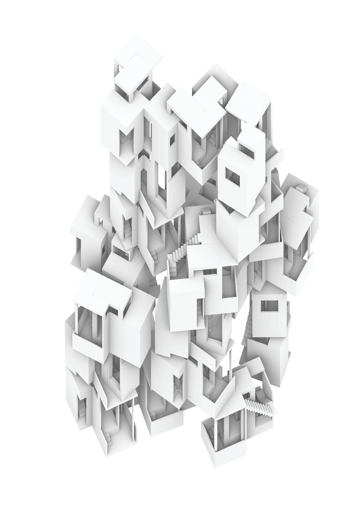 When viewed as a whole, the collective sought to establish lines of connections across each unit through the aggregated openings. The rotation of units around the spine forms an enclosure within, yet allowing views to the exterior beyond.