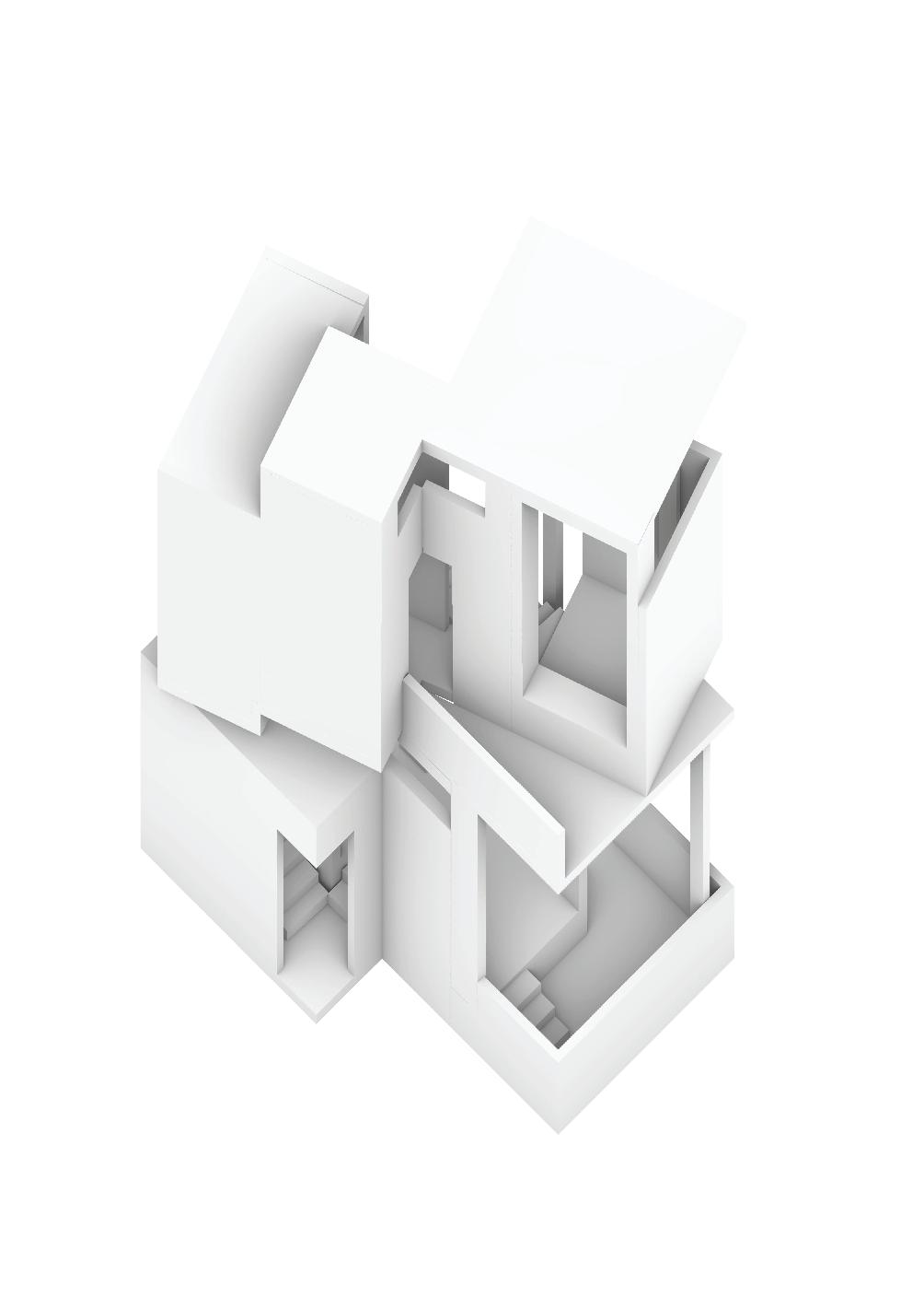 Instead of aggregating cubes to align to one angle per level, units are aggregated based on the mirrored configurations. Contrasting with the internally-facing ground floor, units in the upper levels externally face towards surrounding neighbours near the site. Simultaneously inward and outward facing, the apartment collective becomes a structure that reflects the changing qualities in the urban fabric while having its own internal scheme.