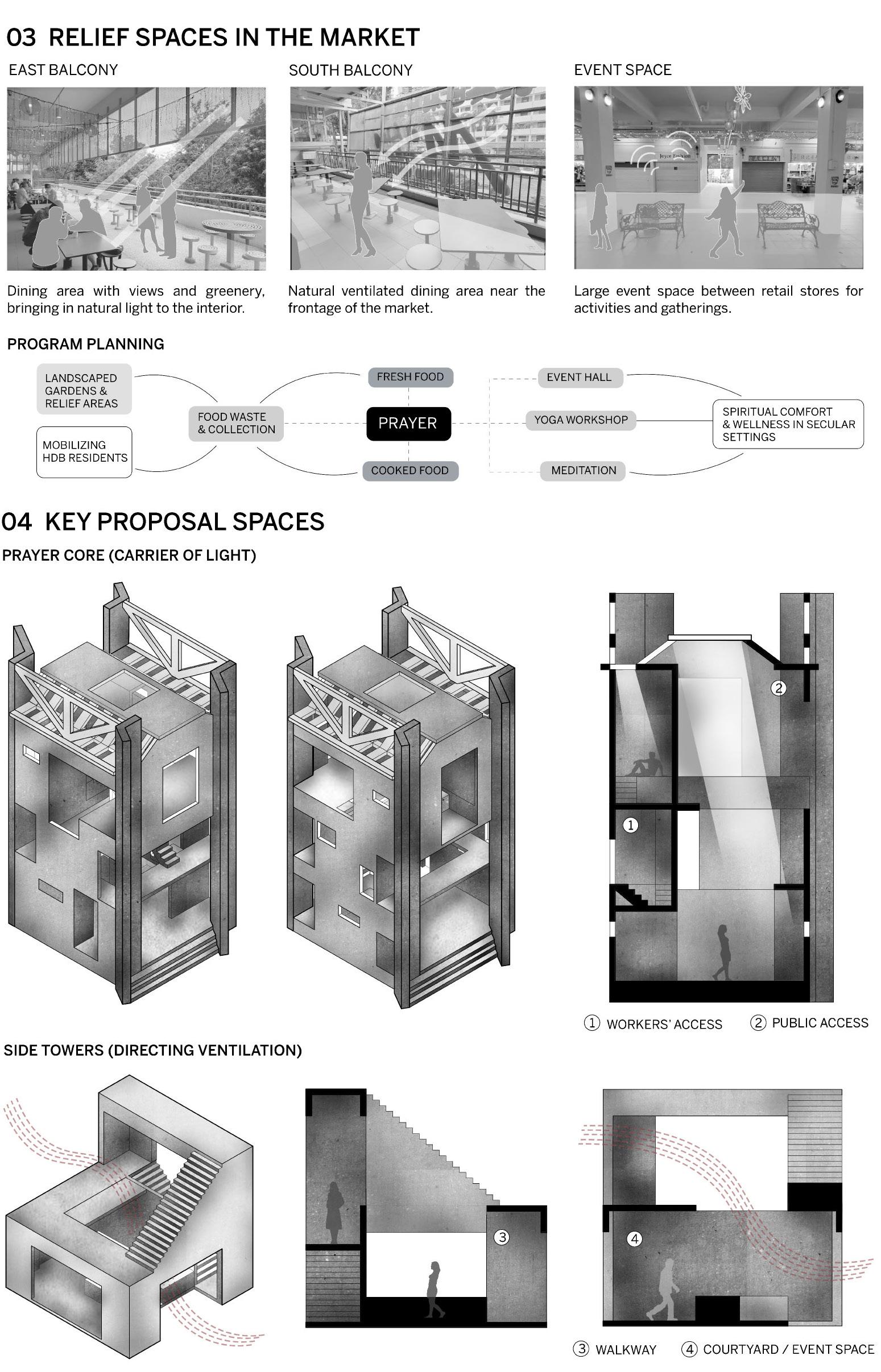 4 FRESH FOOD COURTYARD PRAYER PEDESTRIAN AXIS SERVICE AXIS LVL 3 LVL 2 LVL 1 03 PROGRAMMATIC STRATEGY DINING COOKED FOOD PRAYER VIEWING GALLERY RETAIL OPEN SHRINE PRAYER VIEWING GALLERY INNER SHRINE WORKSHOP SERVICE CIRCULATION