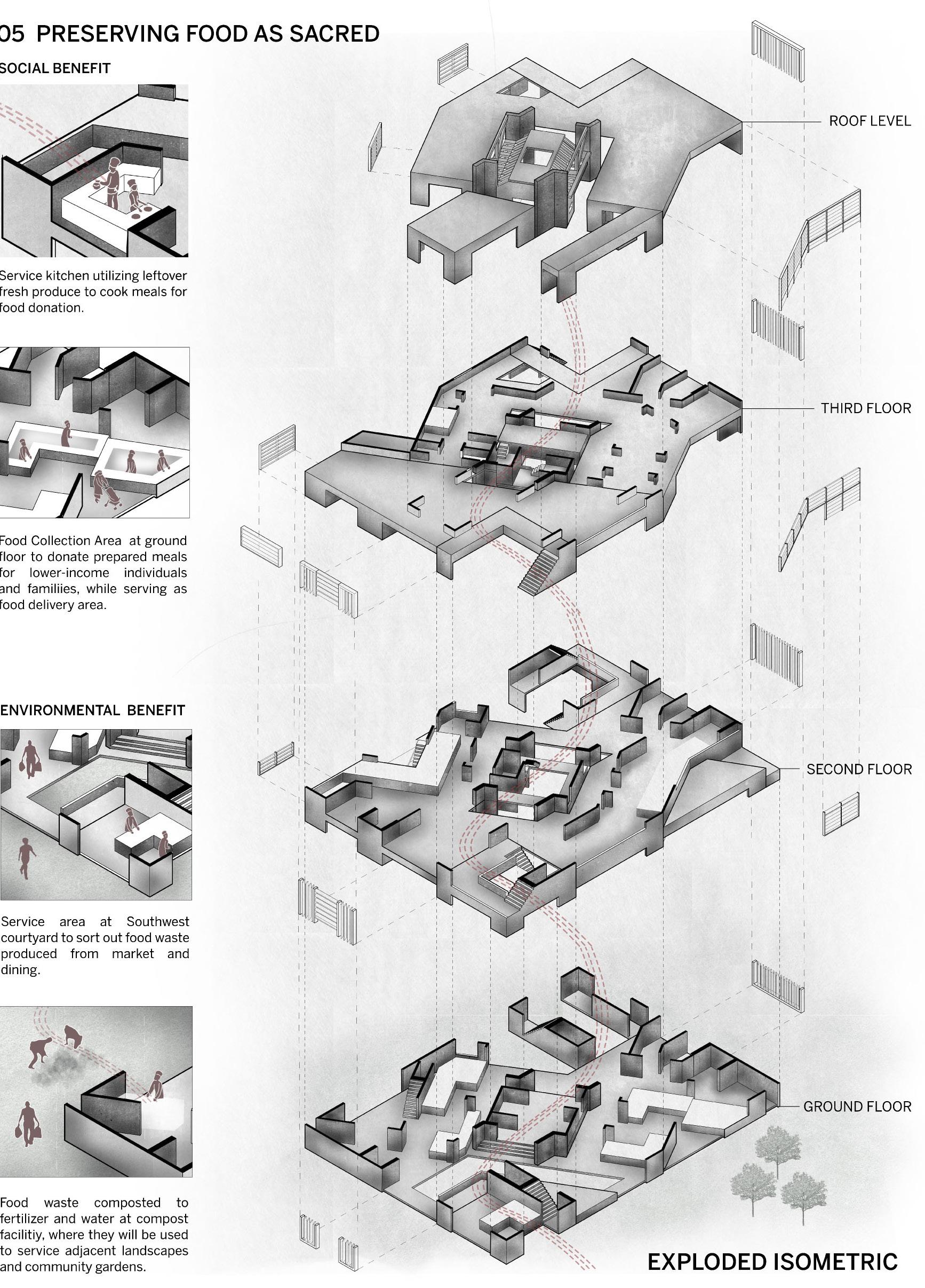 FRESH FOOD COURTYARD PRAYER PEDESTRIAN AXIS SERVICE AXIS LVL 3 LVL 2 LVL 1 MASSING