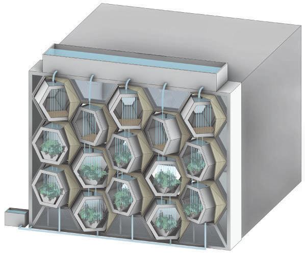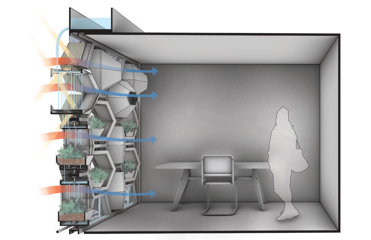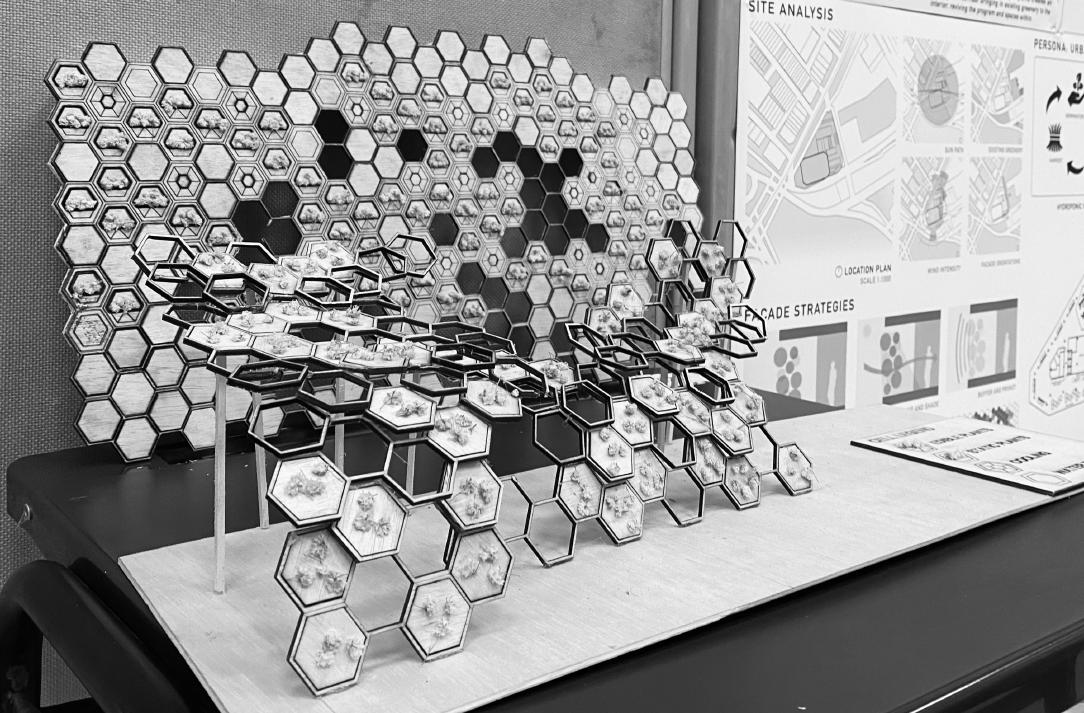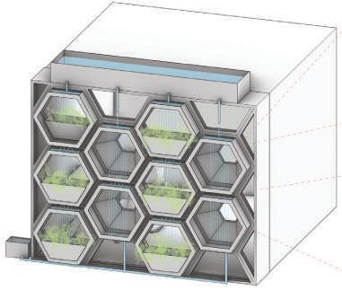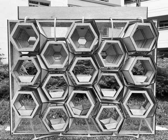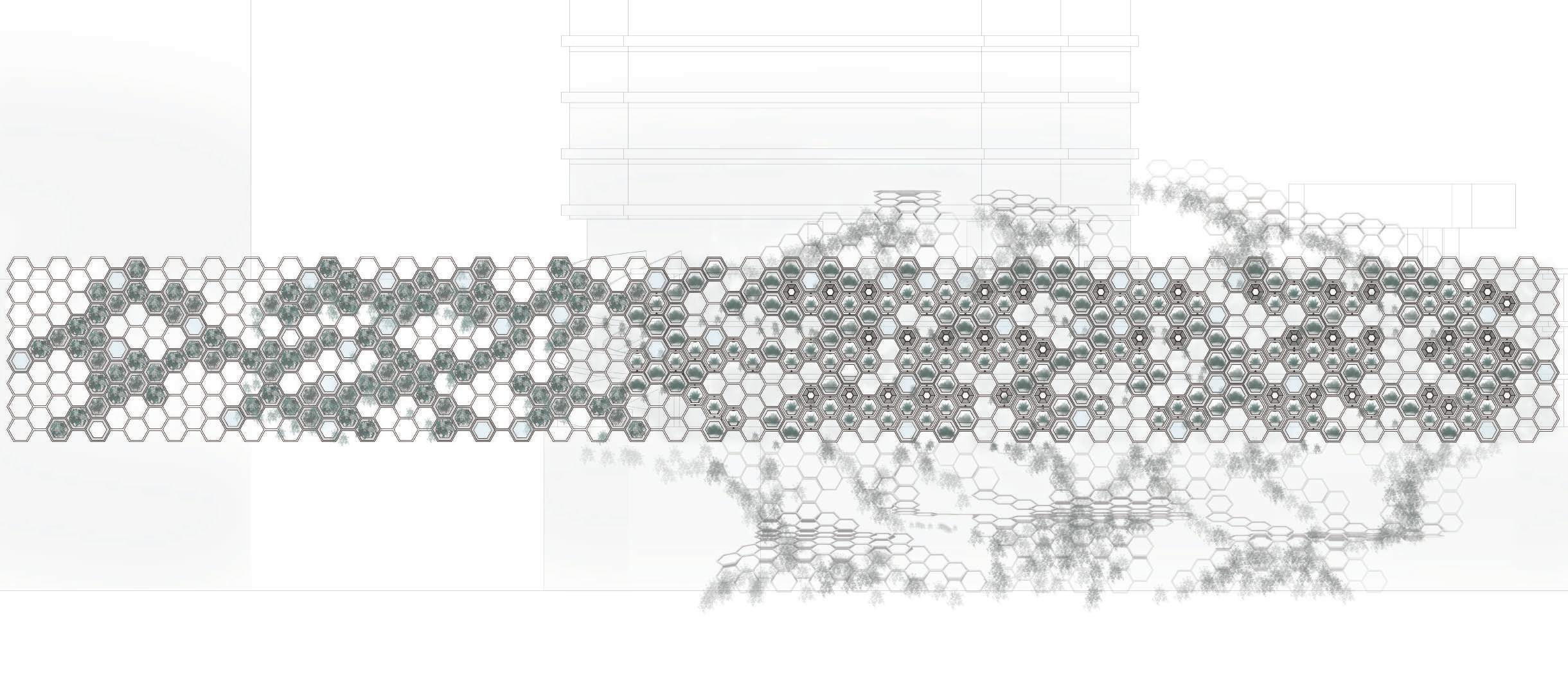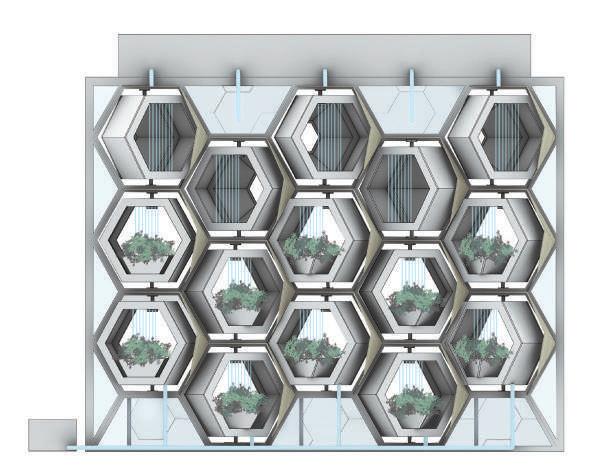 The honeycomb geometry is chosen to represent a hive - a close-knit system supporting the planting process. With a frame as a skeletal basis, cellular components performing functions of planting, cooling and shading protrude out from within, forming a dynamic, heterogeneous colony responding to multiple site conditions. Incorporating various mechanisms, the facade performs like a biological system, where components aggregate to support growth of the plants.