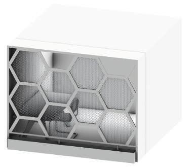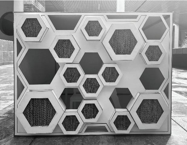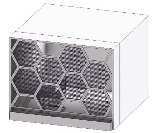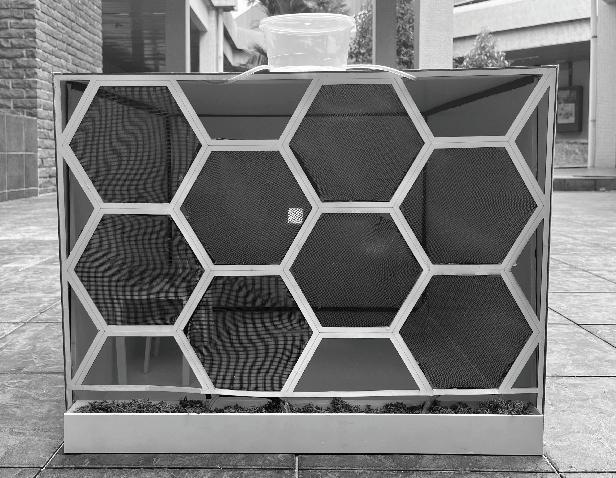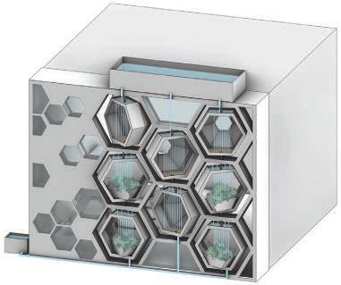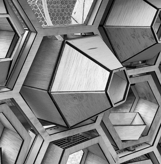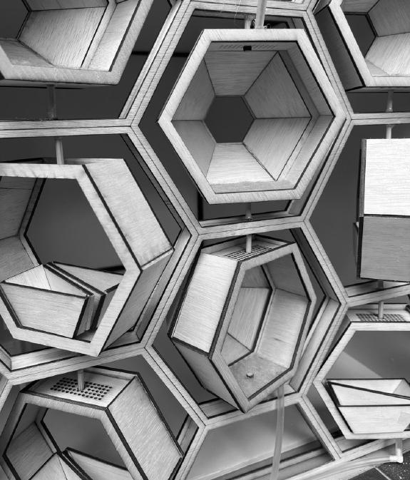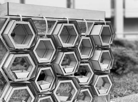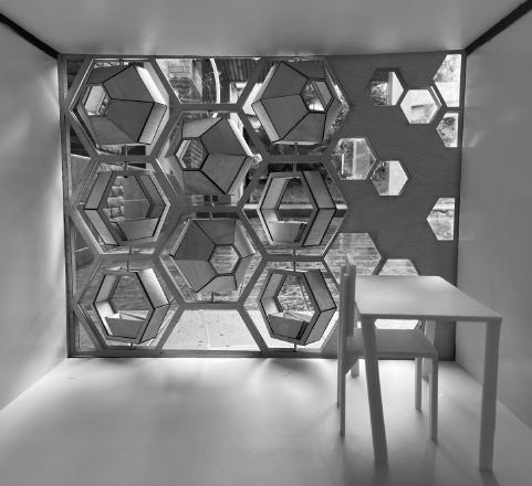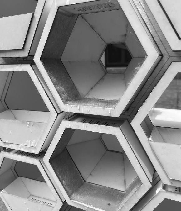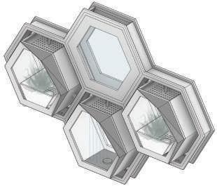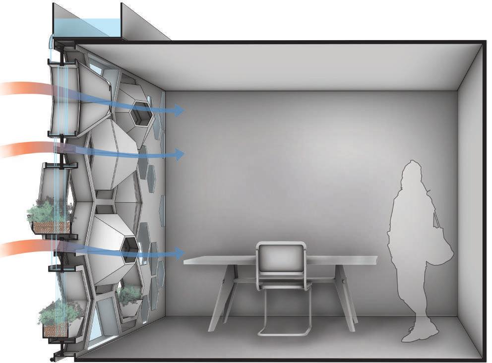The honeycomb geometry is chosen to represent a hive - a close-knit system supporting the planting process. With a frame as a skeletal basis, cellular components performing functions of planting, cooling and shading protrude out from within, forming a dynamic, heterogeneous colony responding to multiple site conditions. Incorporating various mechanisms, the facade performs like a biological system, where components aggregate to support growth of the plants.