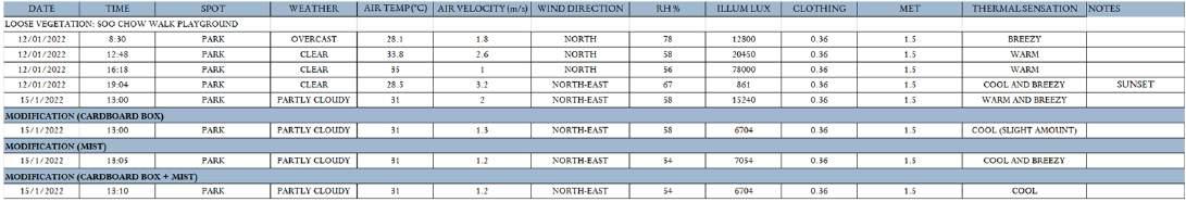 To understand the relation between body and climate, we went down to 4 outdoor locations. One of the locations is at a forest in Upper Thomson. The area is the most shaded and comfortable to reside in due to the huge tree canopy that prevents much of the sun and heat from entering. As the forest is cool enough, our modification is used to test if it can alter our physical perception with the environment further.
