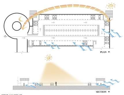 LOCATION PLAN NE SE 12pm 1pm 2pm 3pm 7pm 7am SUN PATH PLANT WATER TANK COOLING HYDROPONIC HARVEST GERMINATION EXISTING GREENERY WIND INTENSITY LIFE AND GROWTH WITHIN COOLING AND SHADE BUFFER AND PRIVACY FACADE ORIENTATIONS SCALE 1:1000