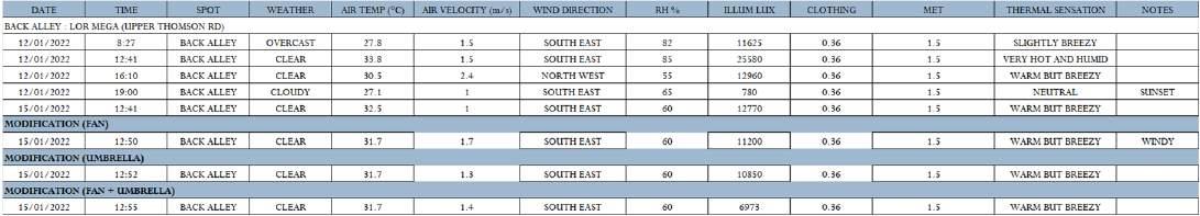 To understand the relation between body and climate, we went down to 4 outdoor locations. One of the locations is at a back alley behind restaurants in Upper Thomson. The area consists of air conditioner vents and exhausts for discharge of waste from shops. The area is relatively stuffy and warm due to the exhaust and its direct exposure to sun. For each area, we added our modification to transform our physical perception of the site.