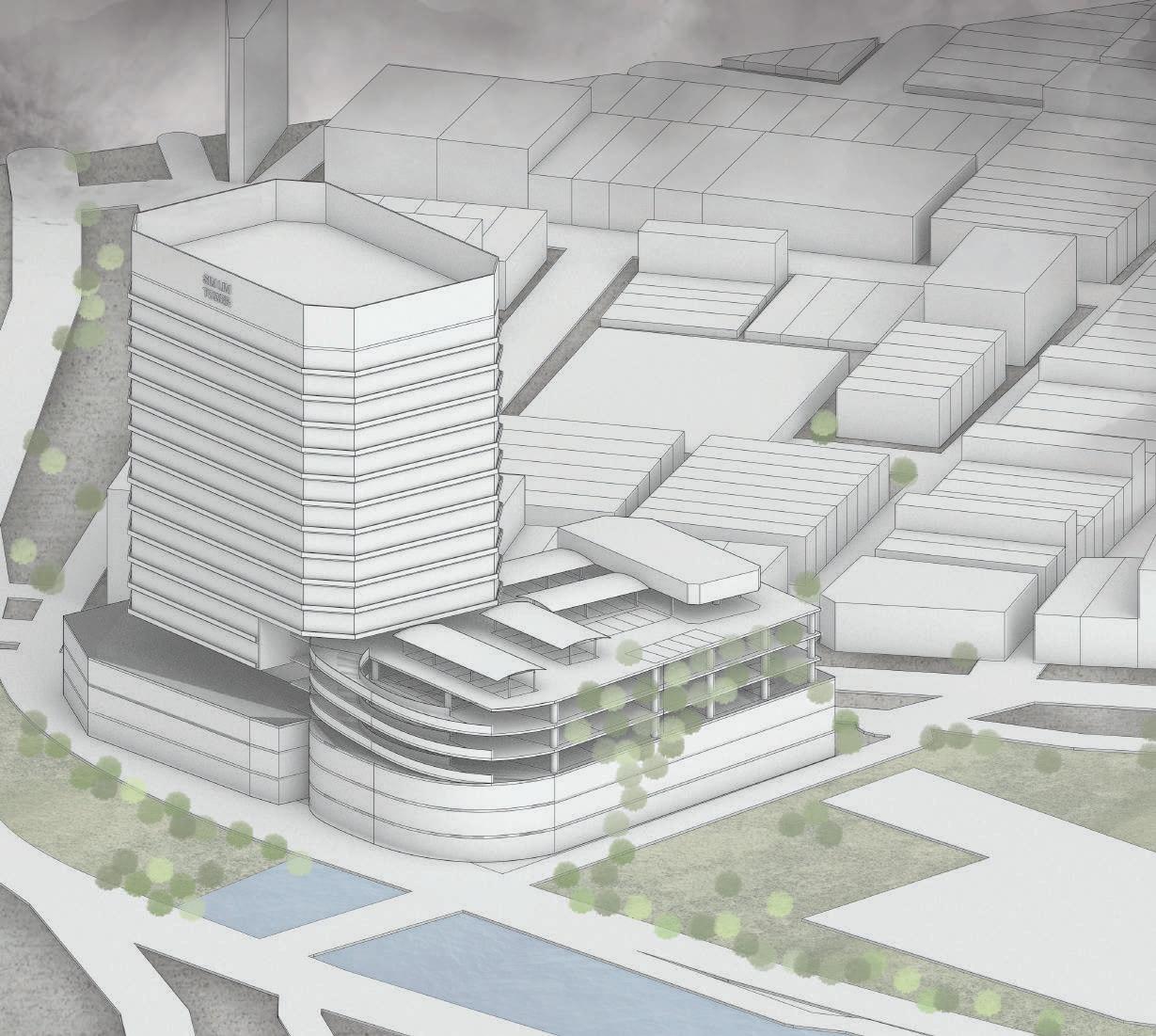 PROPOSED URBAN GREEN CORRIDOR as an office tower with limited electronic retail shops. Through our persona,