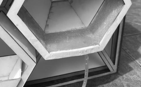 Piping bags containing water are suspended onto the mesh grid, resembling hanging cave icicles. Water drips down from the bags onto the viewer, creating a cooling effect from the scorching heat. Simulating rain, this contraption creates a therapeutic effect as the viewer is surrounded by the dripping water.