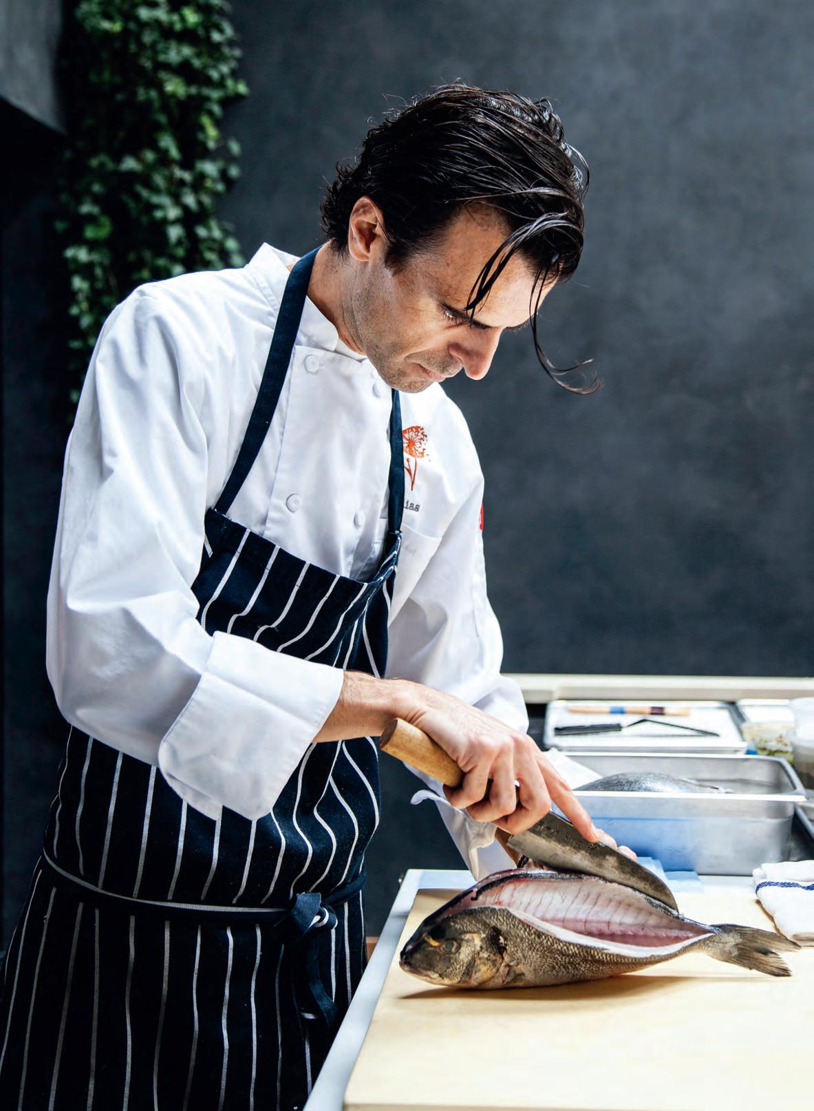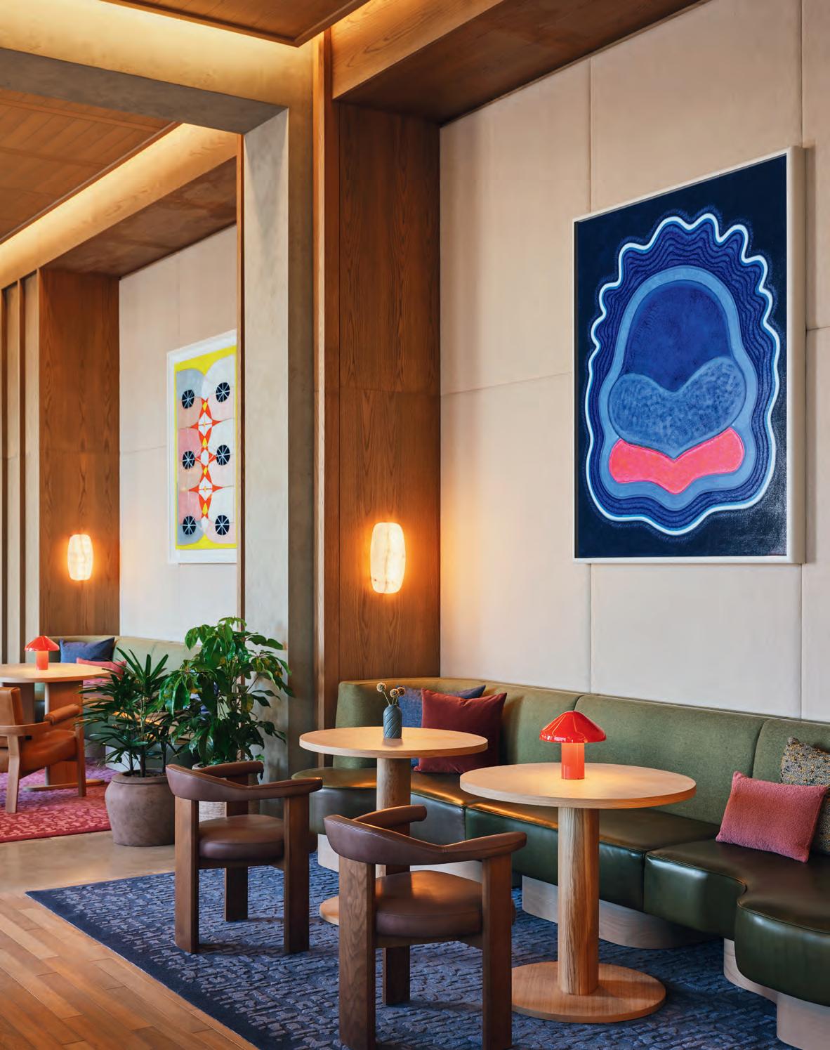 The vaulted ceilings and spherical pendant lamps in this New American restaurant recall the airy feeling of a ’60s deck house—with a vibrant twist. Blocky, geometric